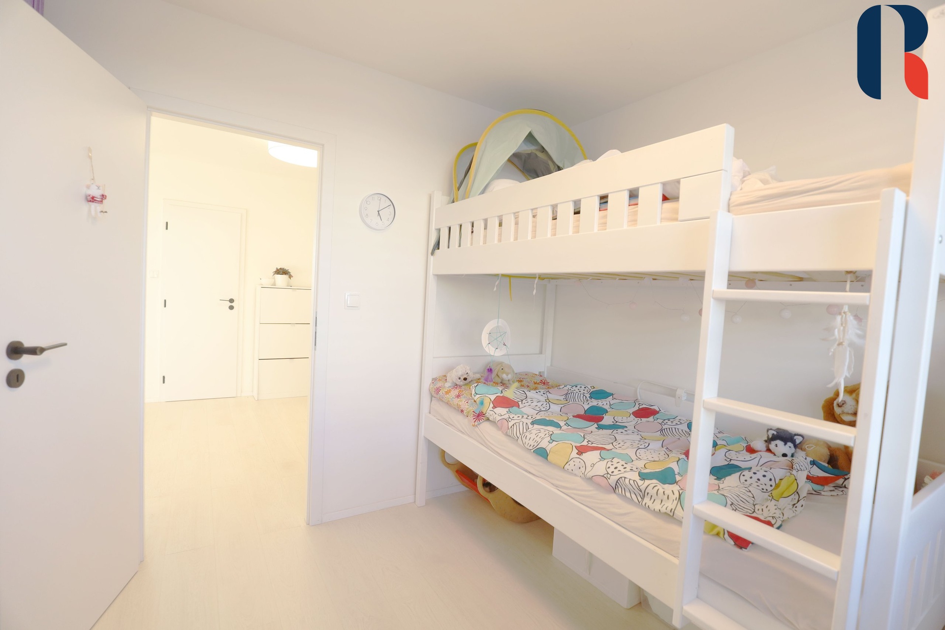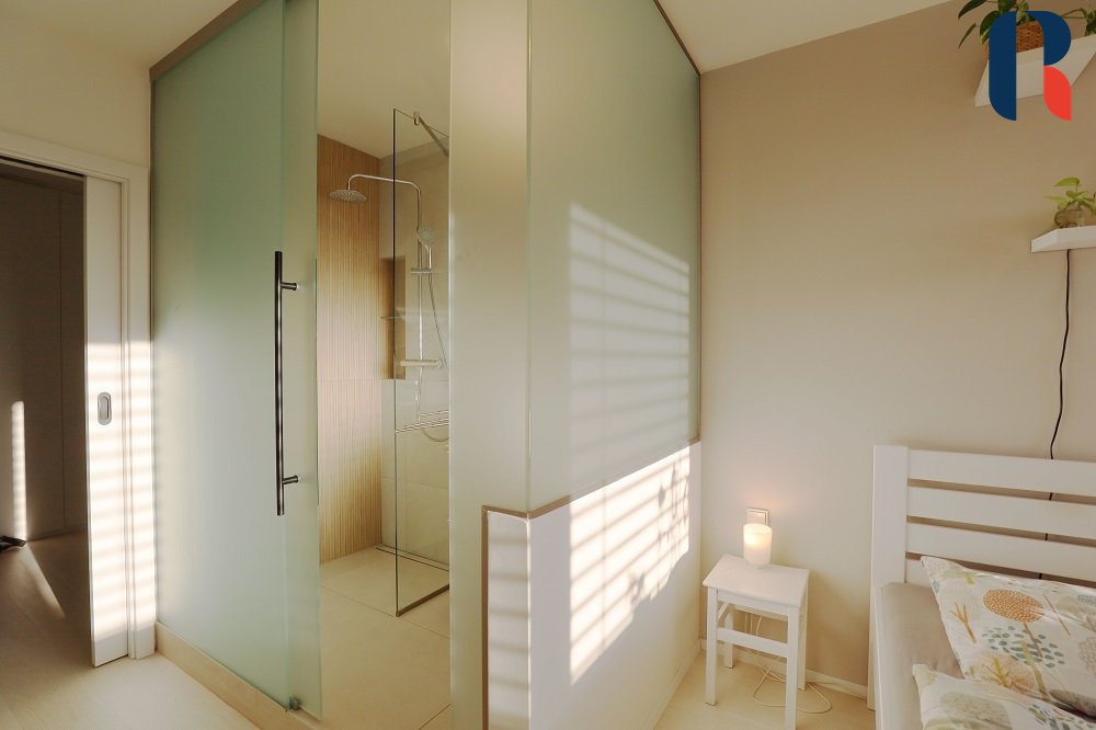 Na levé straně od vstupních dveří se nachází dva samostatné pokoje orientované na východní stranu. Na pravé straně je koupelna s vanou, umyvadlem a wc a samostatné wc. Vedle vstupních dveří se nachází samostatná místnost, která je využívána jako šatna a „technická místnost s vestavěnými skříněmi na míru, aby využily co nejvíce prostoru od podlahy ke stropu. Zajišťují v bytě maximální možnost úložných prostor a zároveň je zde umístěna pračka a sušička. Vstup do ložnice je pouze z této místnosti, čímž je oddělena od hlavní obytné části bytu a nabízí dokonalé soukromí. Při vstupu do ložnice je vlevo umístěna prosklená koupelna s matným sklem, sprchovým koutem a umyvadlem. Lodžie, kuchyň a ložnice jsou orientovány na západní stranu.