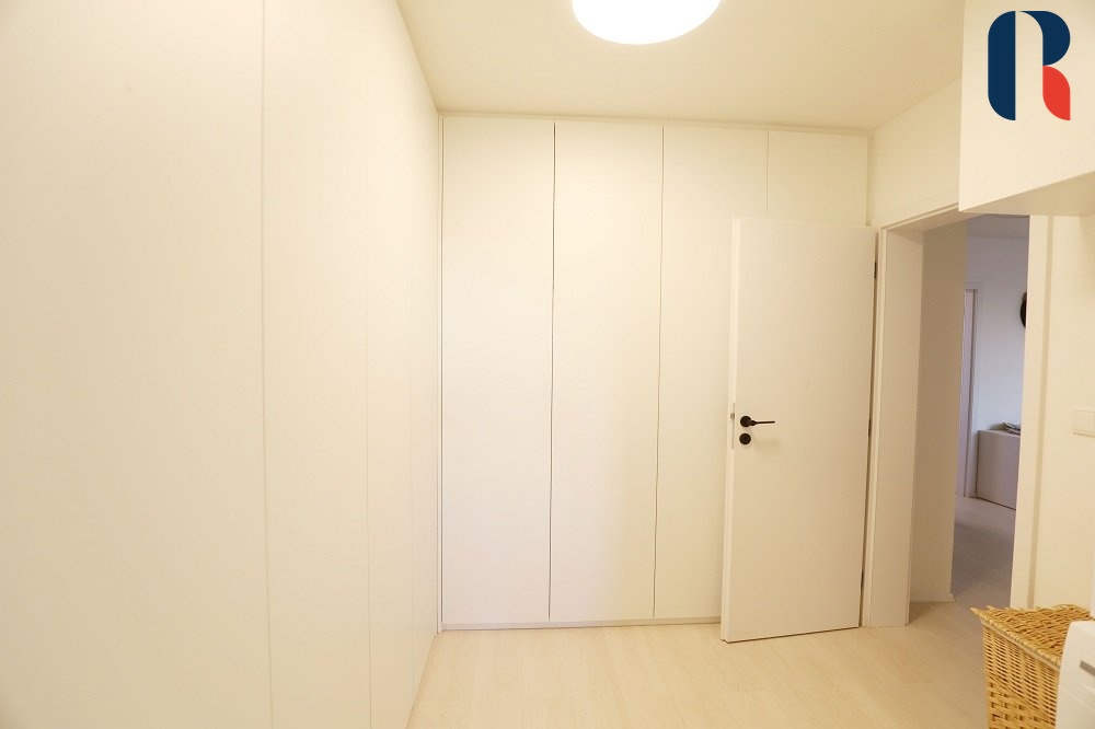 Byt je moderní, funkční, nábytek na míru a vestavěné skříně zajišťují dostatek úložného prostoru. Ve všech pokojích jsou předokenní žaluzie, digitální termostat k regulaci vytápění místností, centrální zhasínání světel a možnost změny barev i teploty stropního světla. Na podlaze je kvalitní bezpečná vinylová podlaha ( bio bez ftalátů), v koupelnách a wc dlažba, bezpečnostní protipožární dveře, vnitřní videotelefon s barevným displejem pro ovládání zámku vchodových dveří do domu vč. výtahu. Ohřev teplé vody i vytápění je dálkovým rozvodem ( radiátory, v koupelnách podlahové vytápění).