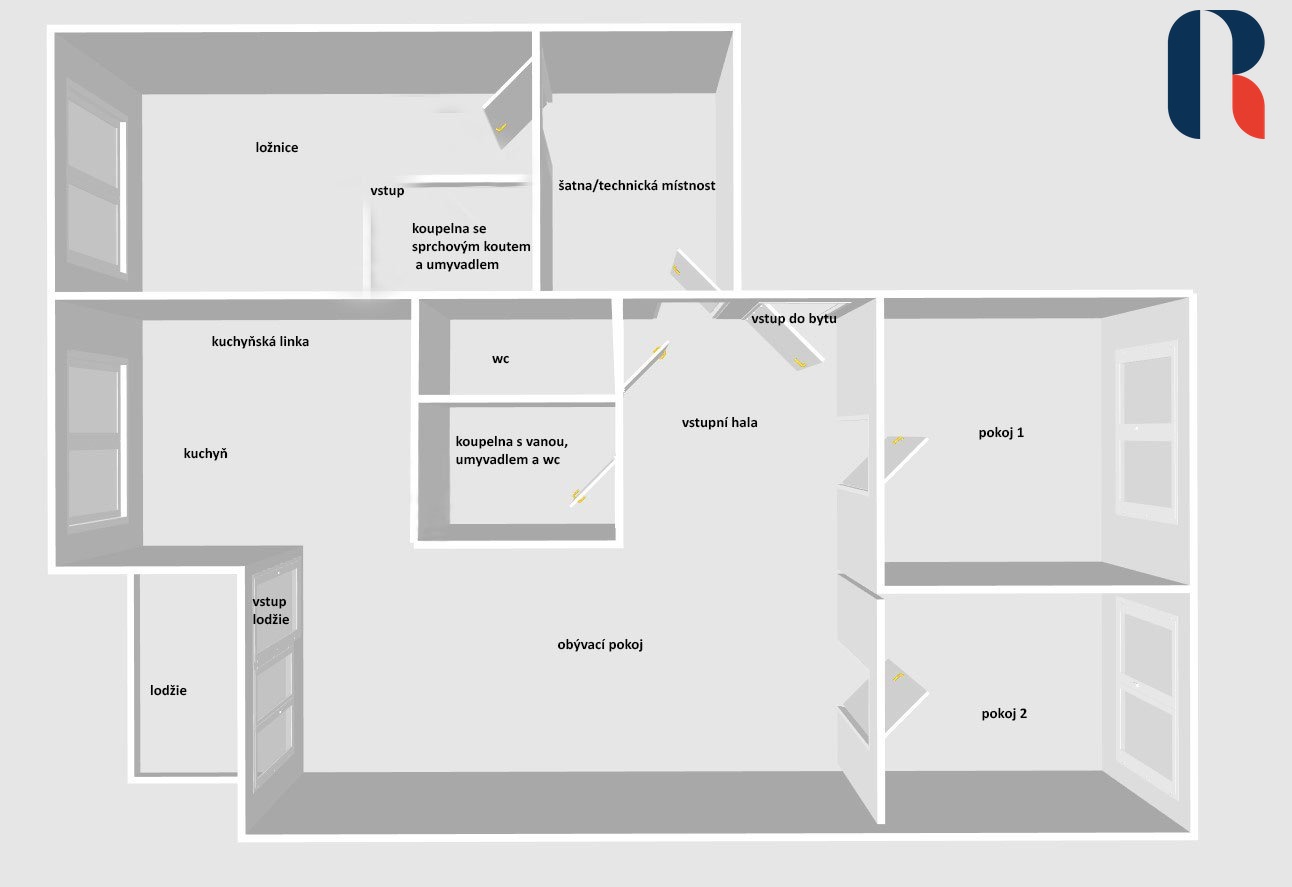 Na levé straně od vstupních dveří se nachází dva samostatné pokoje orientované na východní stranu. Na pravé straně je koupelna s vanou, umyvadlem a wc a samostatné wc. Vedle vstupních dveří se nachází samostatná místnost, která je využívána jako šatna a „technická místnost" s pračkou, sušičkou a vestavěnými skříněmi na míru. Vstup do ložnice je pouze z této místnosti, čímž je oddělena od hlavní obytné části bytu a nabízí dokonalé soukromí. Při vstupu do ložnice je vlevo umístěna prosklená koupelna s matným sklem, sprchovým koutem a umyvadlem. Lodžie, kuchyň a ložnice jsou orientovány na západní stranu.