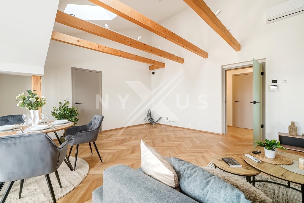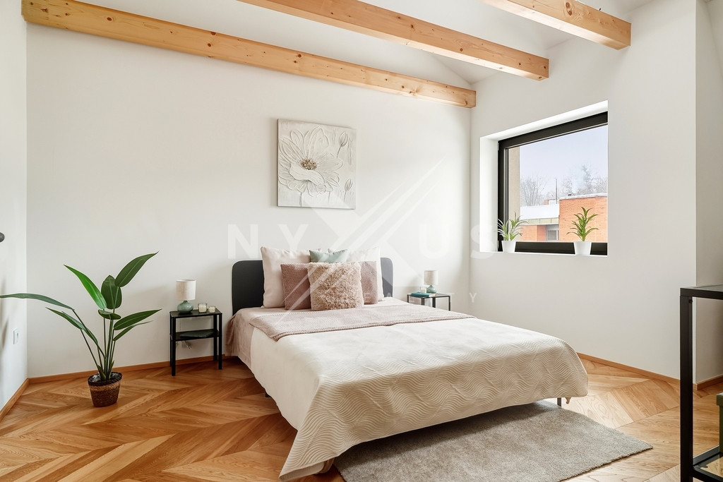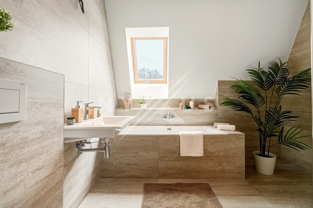 Další přidanou hodnotou je pochozí půda s okny o velikosti 20 m², která rozšiřuje využitelný prostor a podtrhuje celkový charakter nemovitosti. Bydlení tak působí jako kombinace bytu, menšího domu a loftového prostoru.