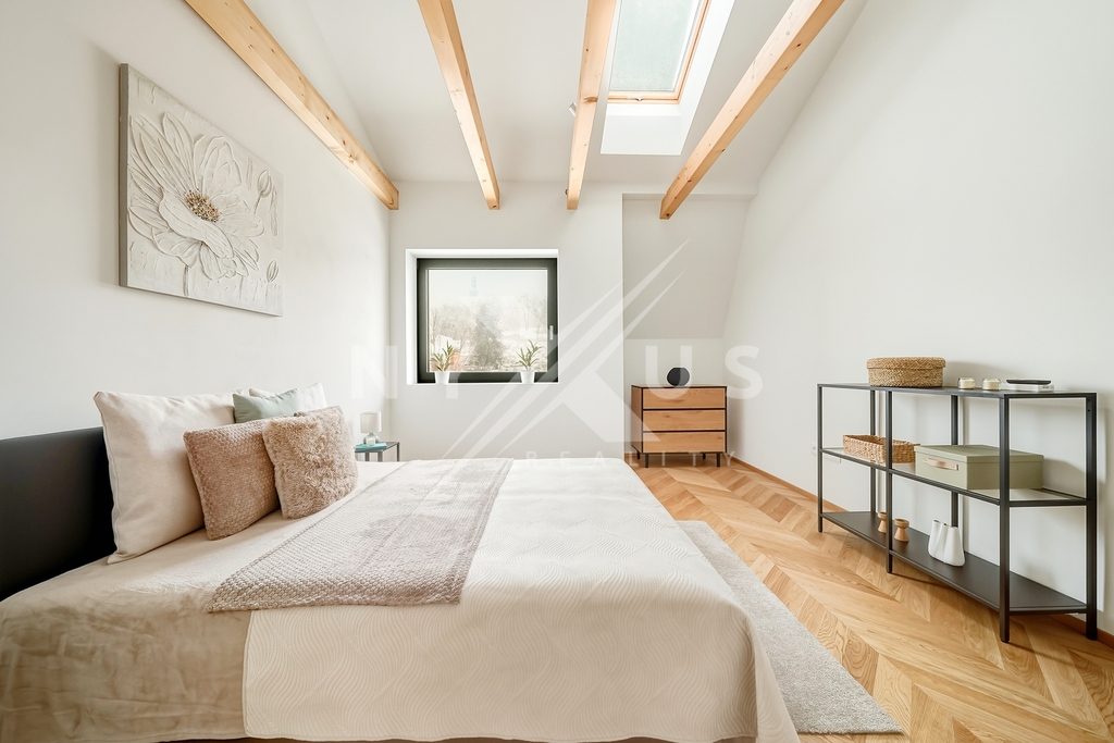 Tento prostorný byt 4+kk o celkové užitné ploše 164 m² včetně příslušenství se nachází v kompletně zrekonstruované prvorepublikové vile na Zbraslavi, kde byl kladen důraz na zachování charakteru stavby i kvalitu provedení. Velkým benefitem je samostatná místnost v suterénu o velikosti 25 m², která má vlastní okno a nepůsobí tak jako klasický sklep. Díky tomu je plnohodnotně využitelná například jako pracovna, fitness, hobby místnost nebo zázemí pro podnikání. Součástí je zároveň i další, zděný sklep o velikosti 9 m², který poskytuje praktický úložný prostor.