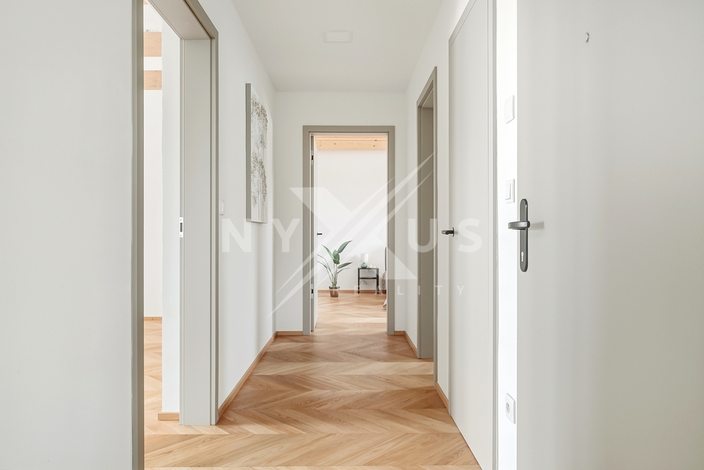 Interiér přirozeně kombinuje moderní technologie s elegantním provedením. Dubové podlahy ve vzoru chevron navazují na historický charakter vily, zatímco okna a terasové dveře s izolačními trojskly zajišťují vysoký akustický i tepelný komfort. Koupelna je vybavena sanitou značek Villeroy & Boch a Hansgrohe, doplněnou velkoformátovými obklady italského výrobce Casalgrande Padana. Celkový standard podtrhují také interiérové designové dveře Vekra s magnetickými zámky.
