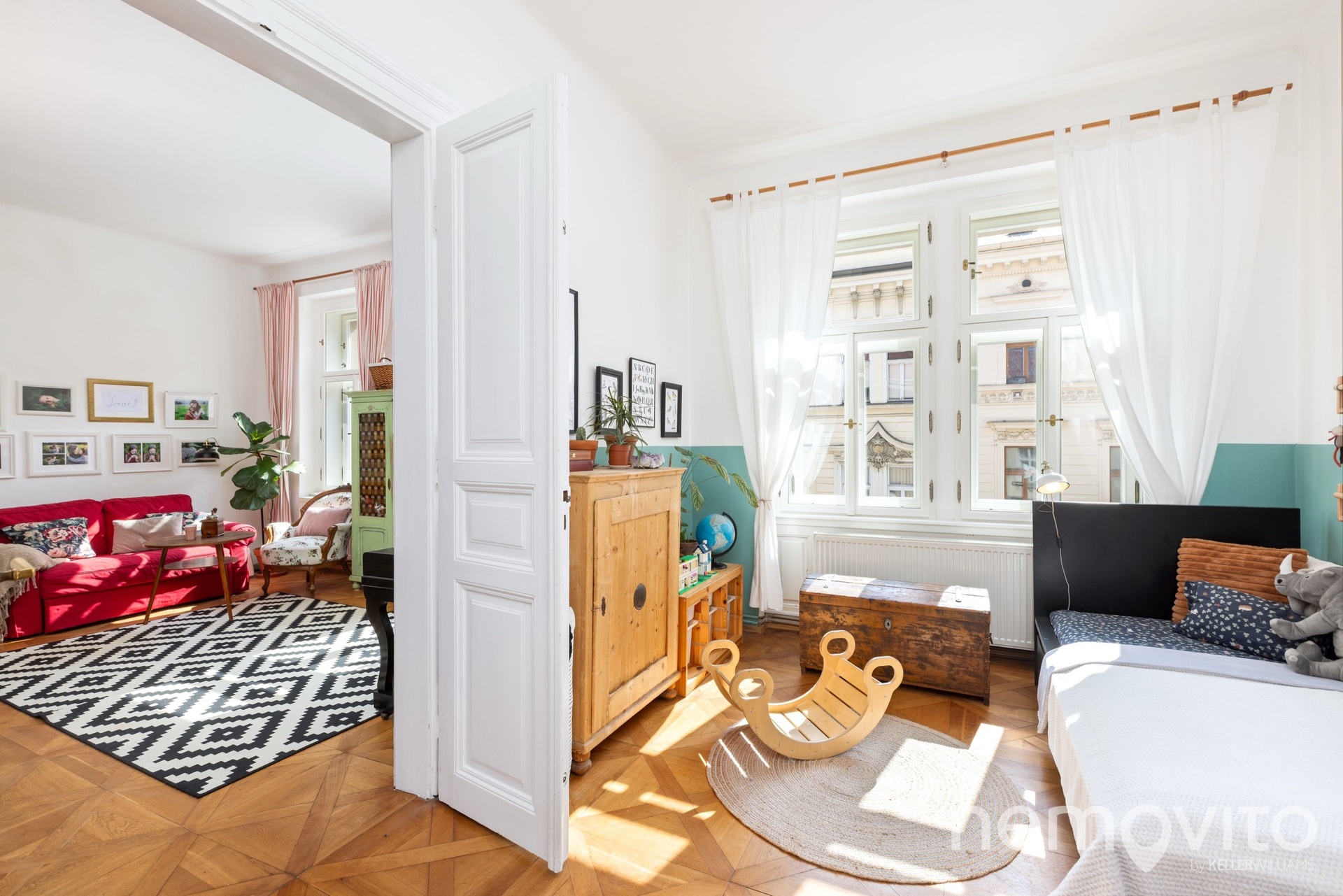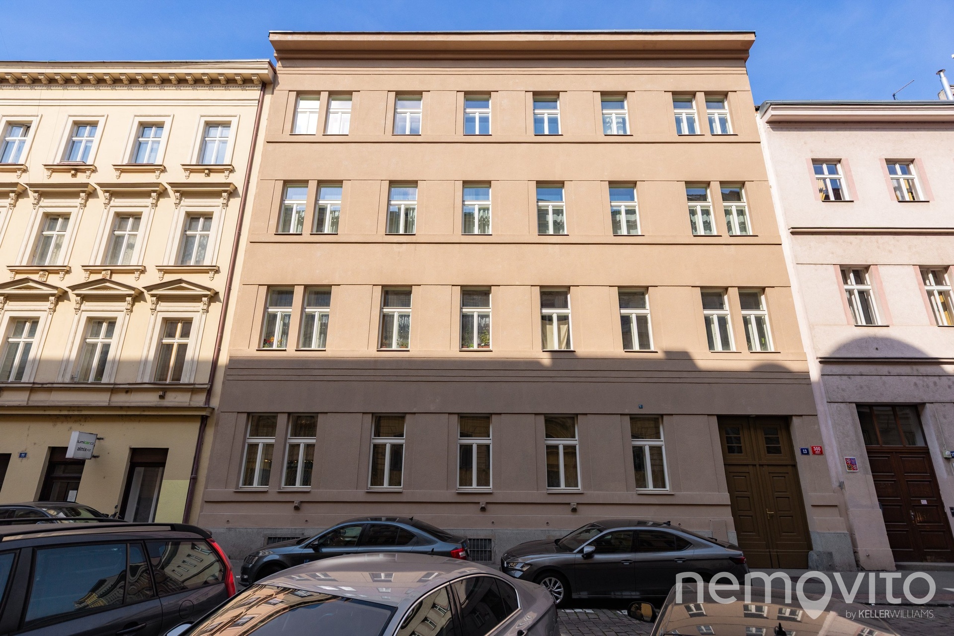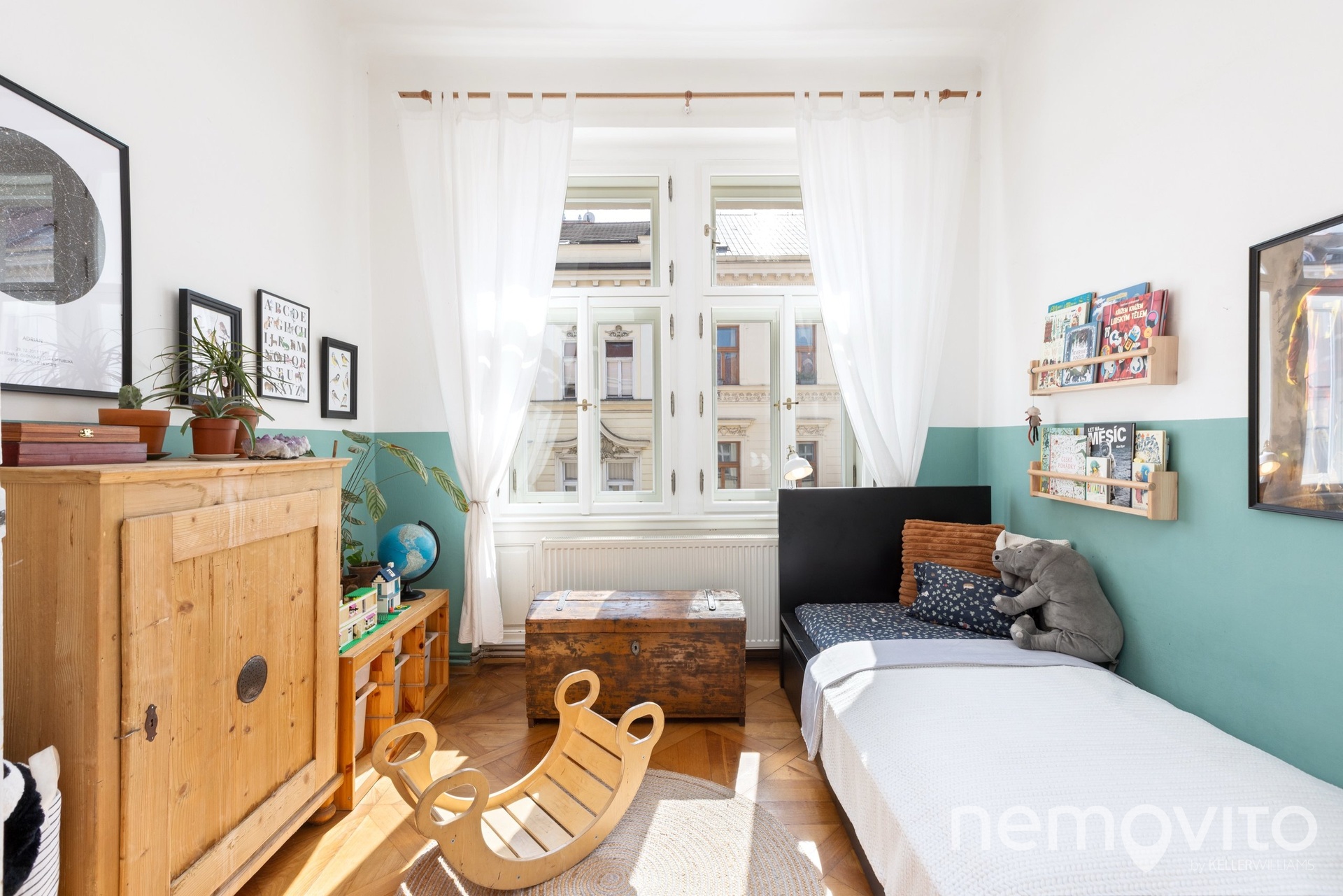 Původní dřevěná podlaha, repasovaná dveře vč. zdobených výplní, původní kliky a 330 cm vysoké stropy bez umělých podhledů. Ve čtvrtém podlaží kompletně zrekonstruovaného domu je díky velkým novým oknům spousta světla. Nejen světlo, ale i prostor - 110 m2 (k tomu ještě sklep) je solidní porce místa pro 4 velké pokoje, komoru, samostatné WC a stylovou koupelnu.