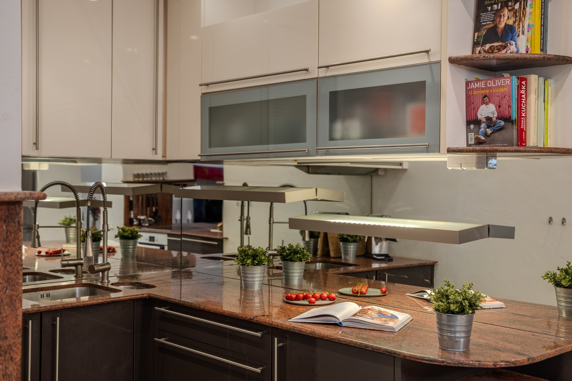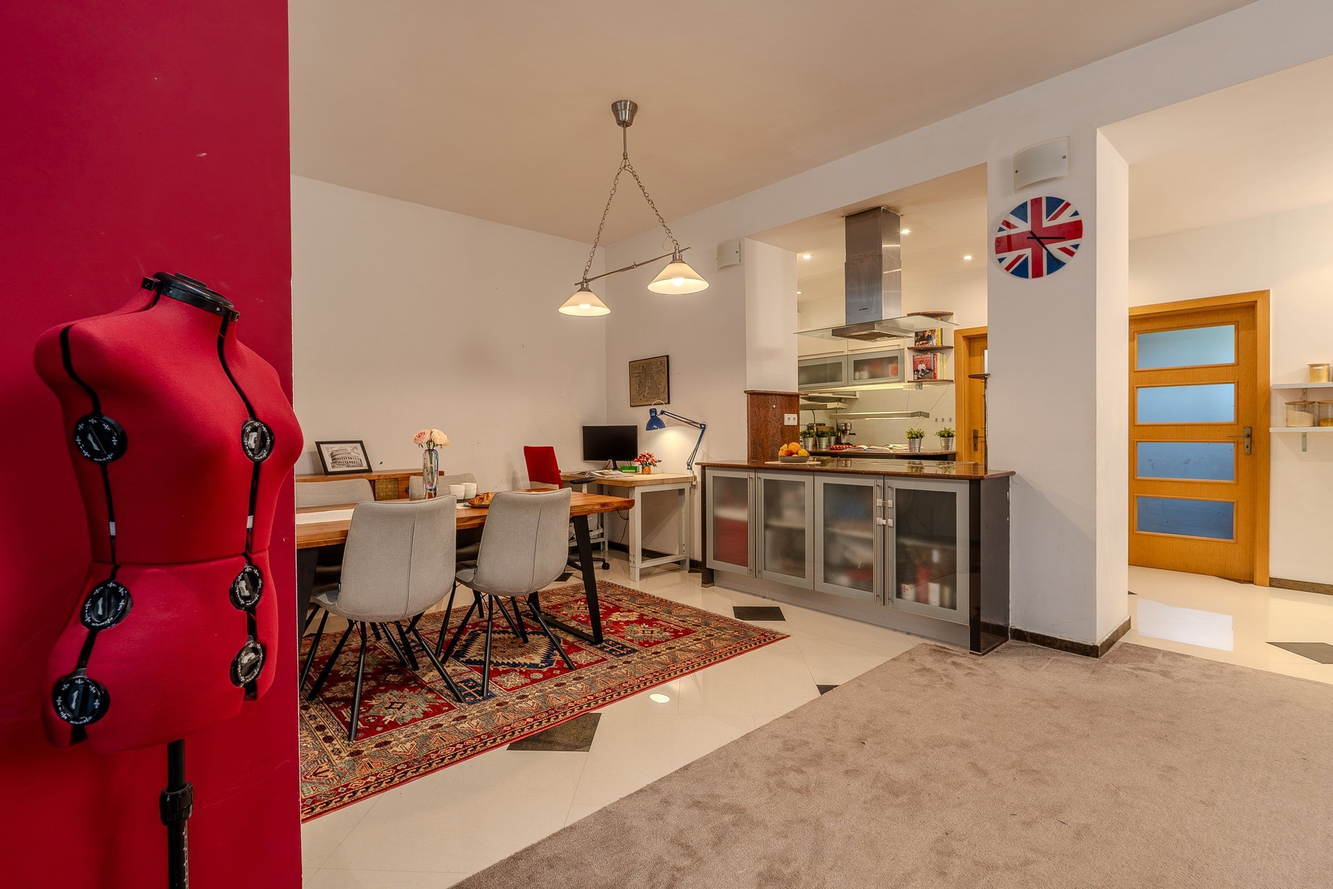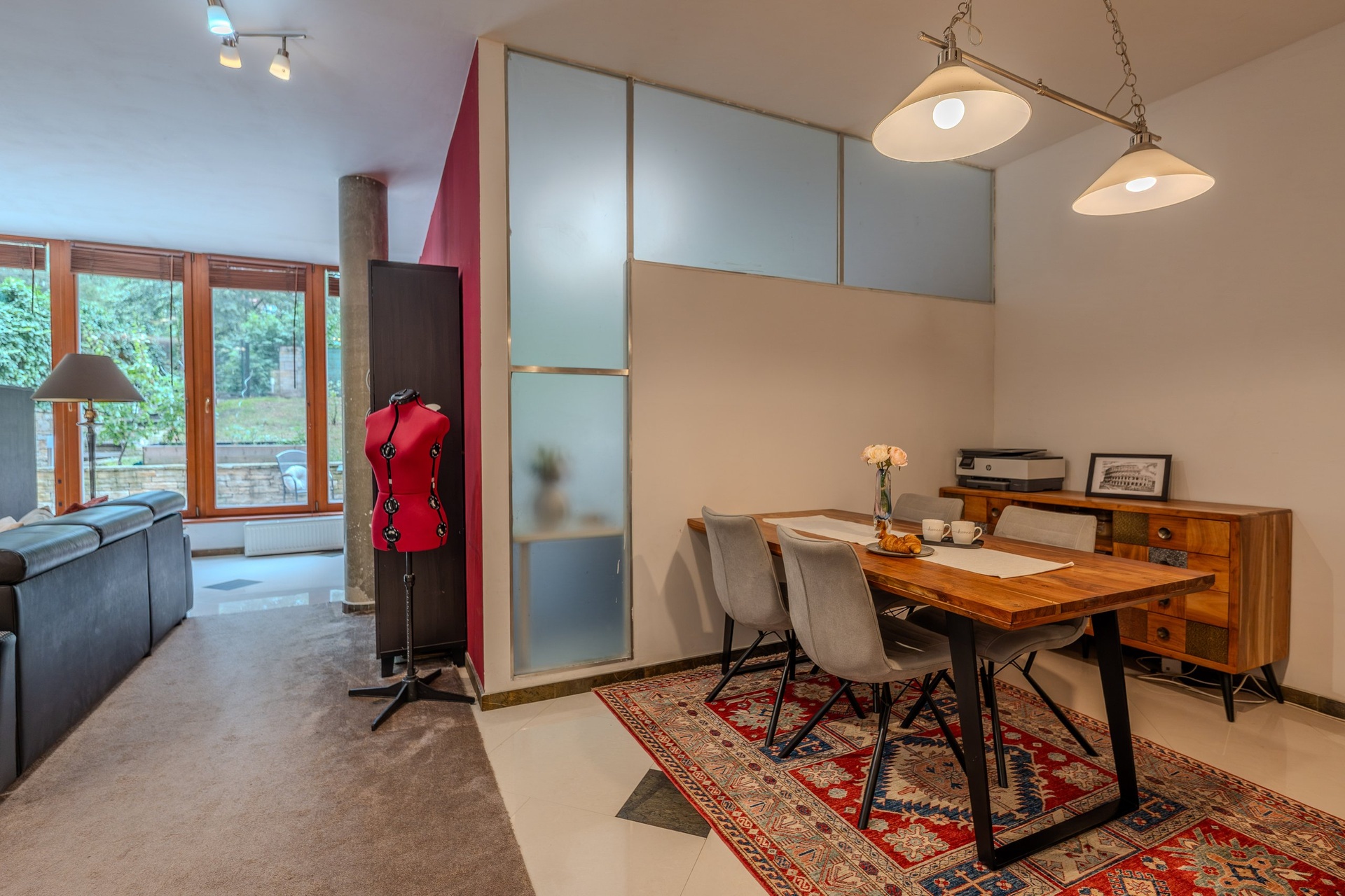 Dominantou bytu je velkorysý obývací pokoj spojený s jídelnou a kuchyňským koutem. Celý prostor je prosvětlen velkoformátovými okny s výhledem na zahradu s terasou, která je přístupná i dveřmi z ložnice. Kuchyně zaujme kamennými deskami a originálním provedením se zrcadly, které prostor opticky zvětšují.