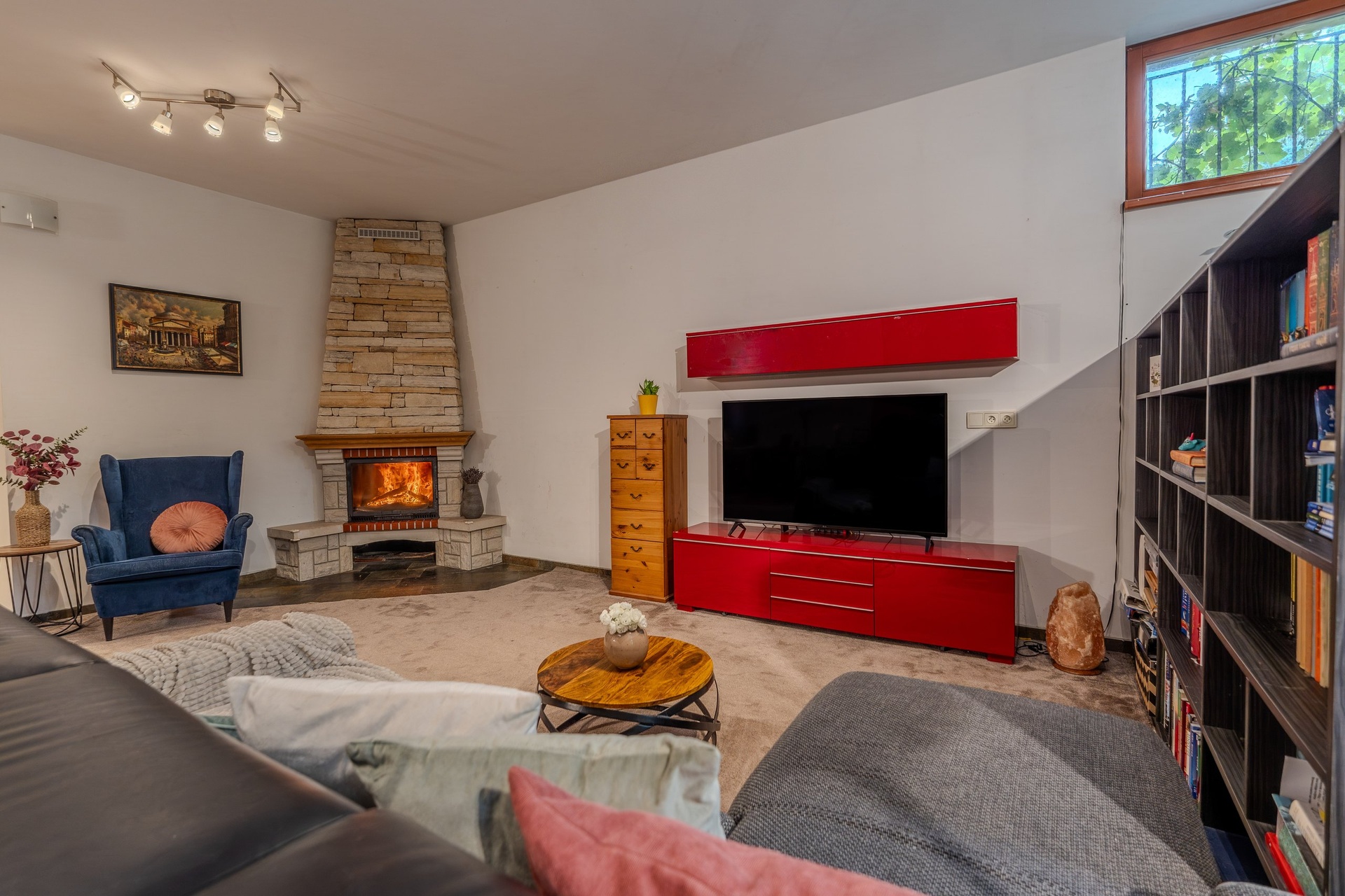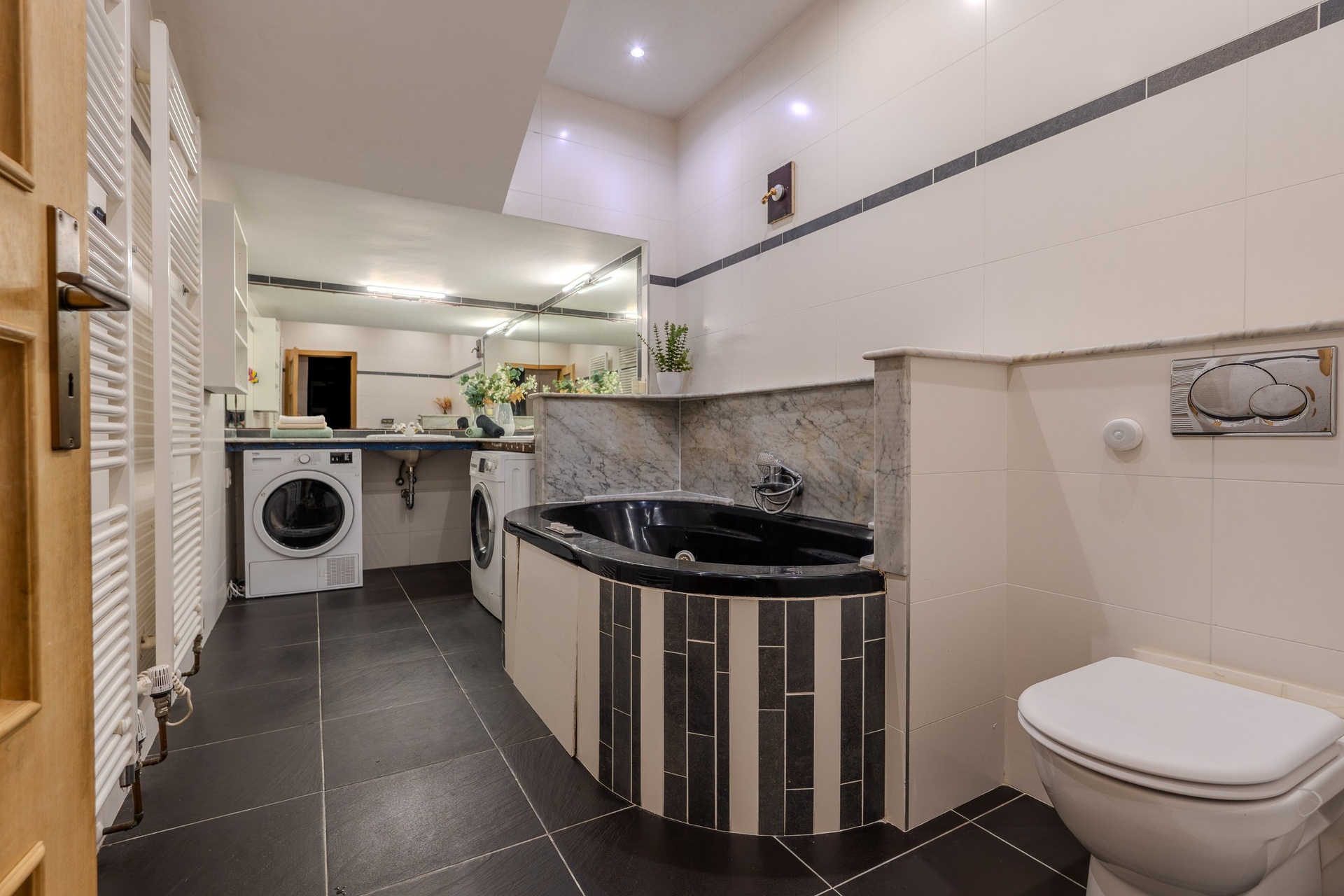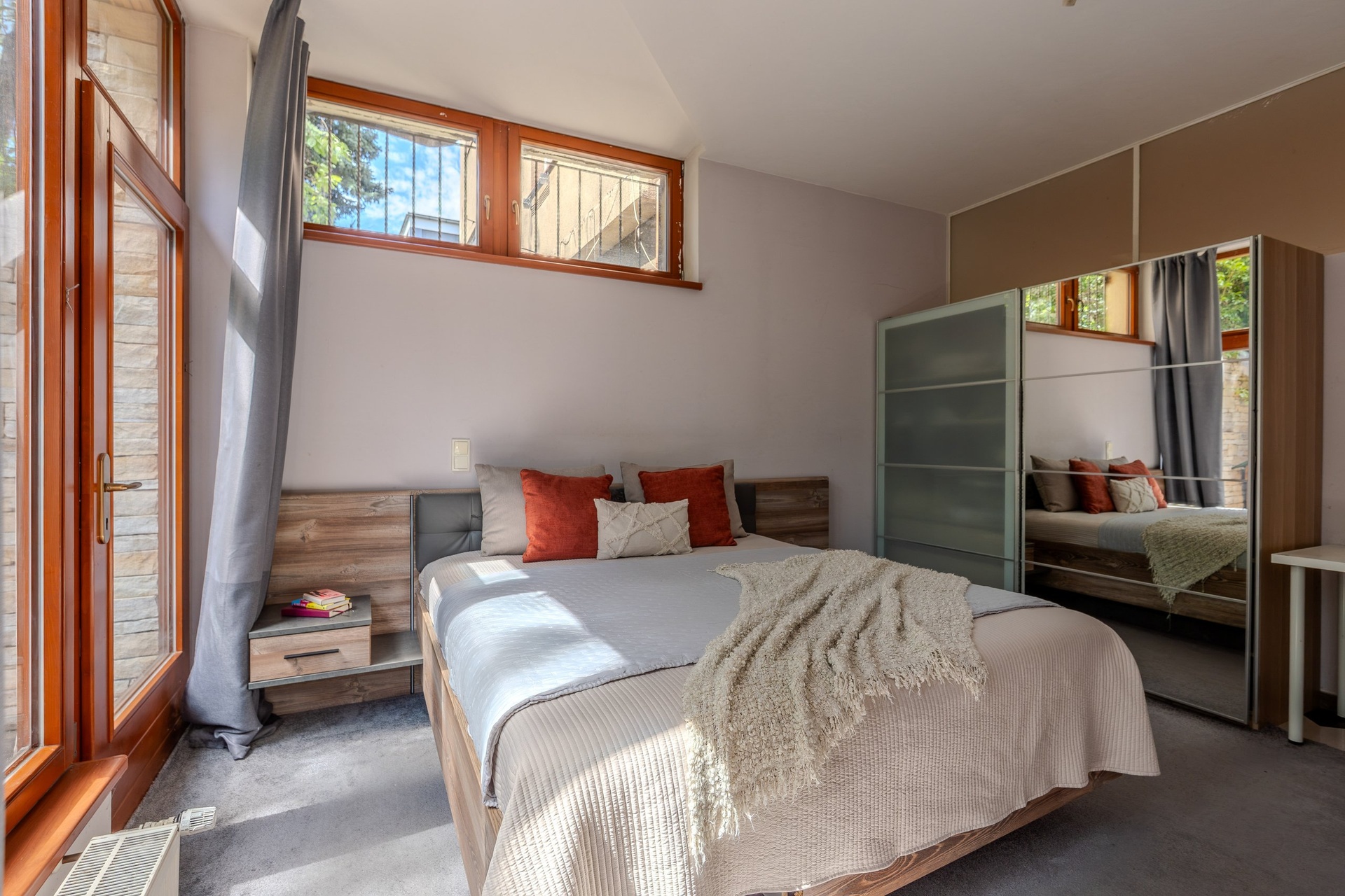 Dominantou bytu je velkorysý obývací pokoj spojený s jídelnou a kuchyňským koutem. Celý prostor je prosvětlen velkoformátovými okny s výhledem na zahradu s terasou, která je přístupná i dveřmi z ložnice. Kuchyně zaujme kamennými deskami a originálním provedením se zrcadly, které prostor opticky zvětšují.