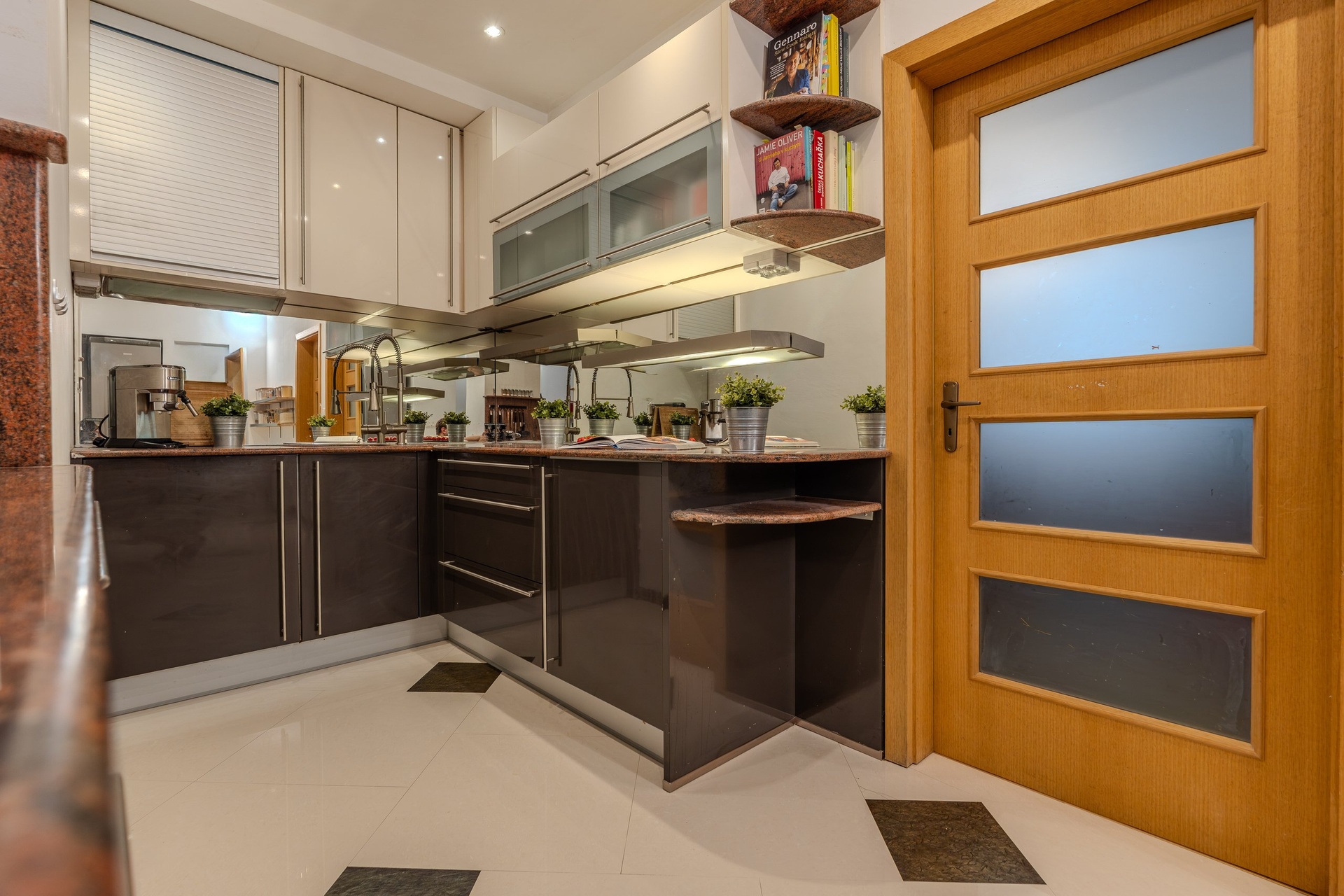 Za kuchyní jsou dva další pokoje, praktická komora a koupelna. Vytápění bytu je řešeno podlahovým topením a radiátory.