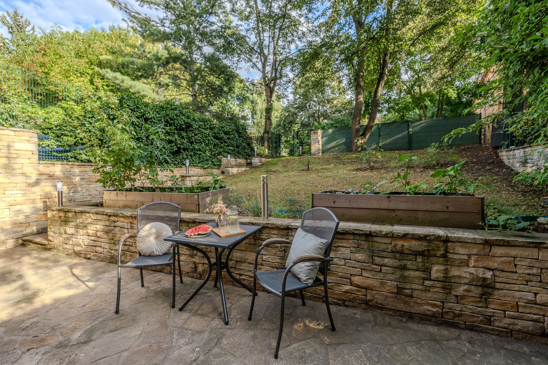 Oplocený pozemek nabízí celkem 179 m² (82 m² v osobní vlastnictví a 97 m² v dlouhodobém pronájmu od Hl. m.). Díky vzrostlým stromům a situováním pozemku do vnitrobloku poskytuje terasa se zahradou naprosté soukromí. Najdete zde prostor jak pro relaxaci, tak pro pěstitelské aktivity. Pro pohodlnou údržbu je na terasu zavedena voda. U brány je připravena elektřina pro instalaci automatického pohonu brány na dálkové ovládání.
