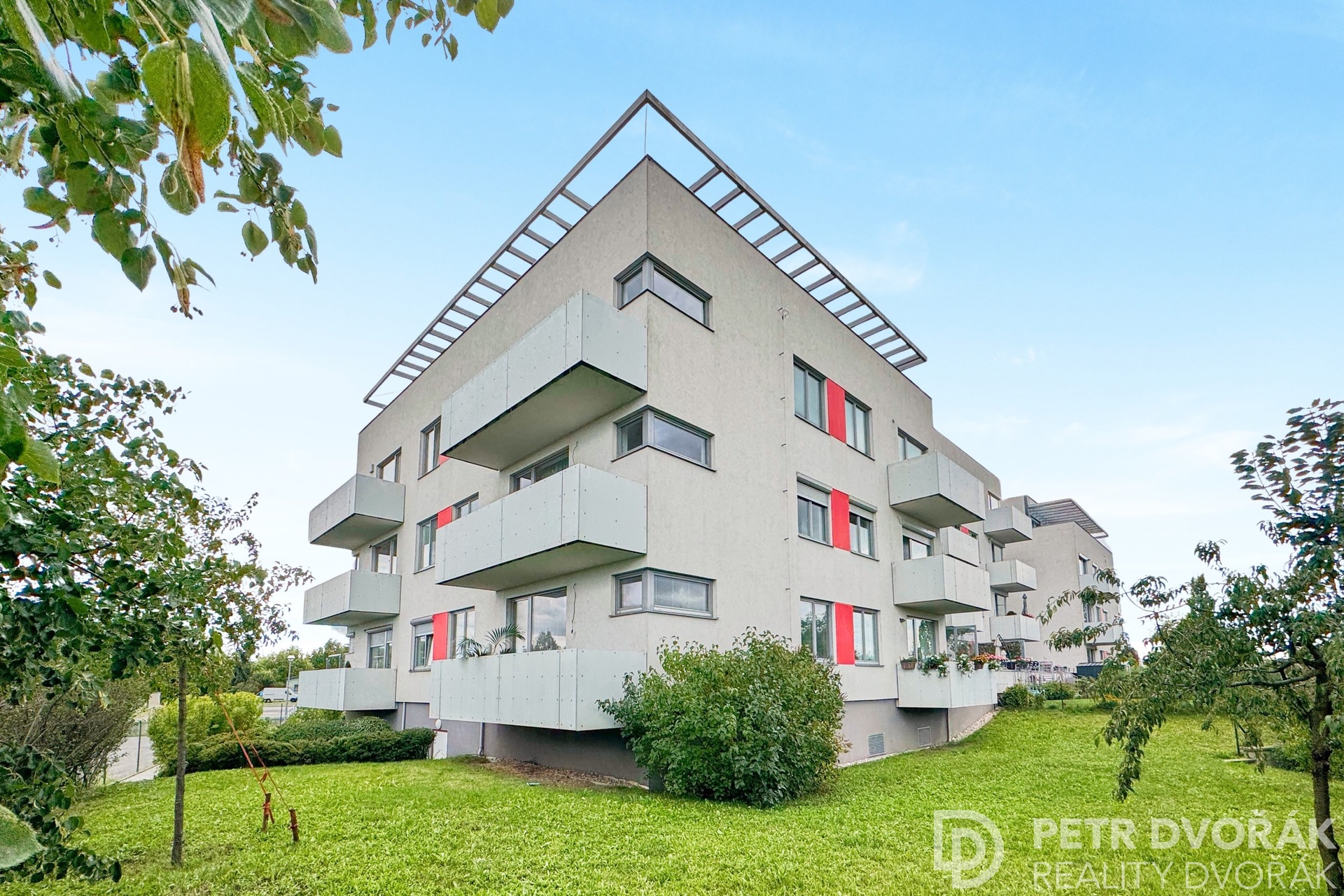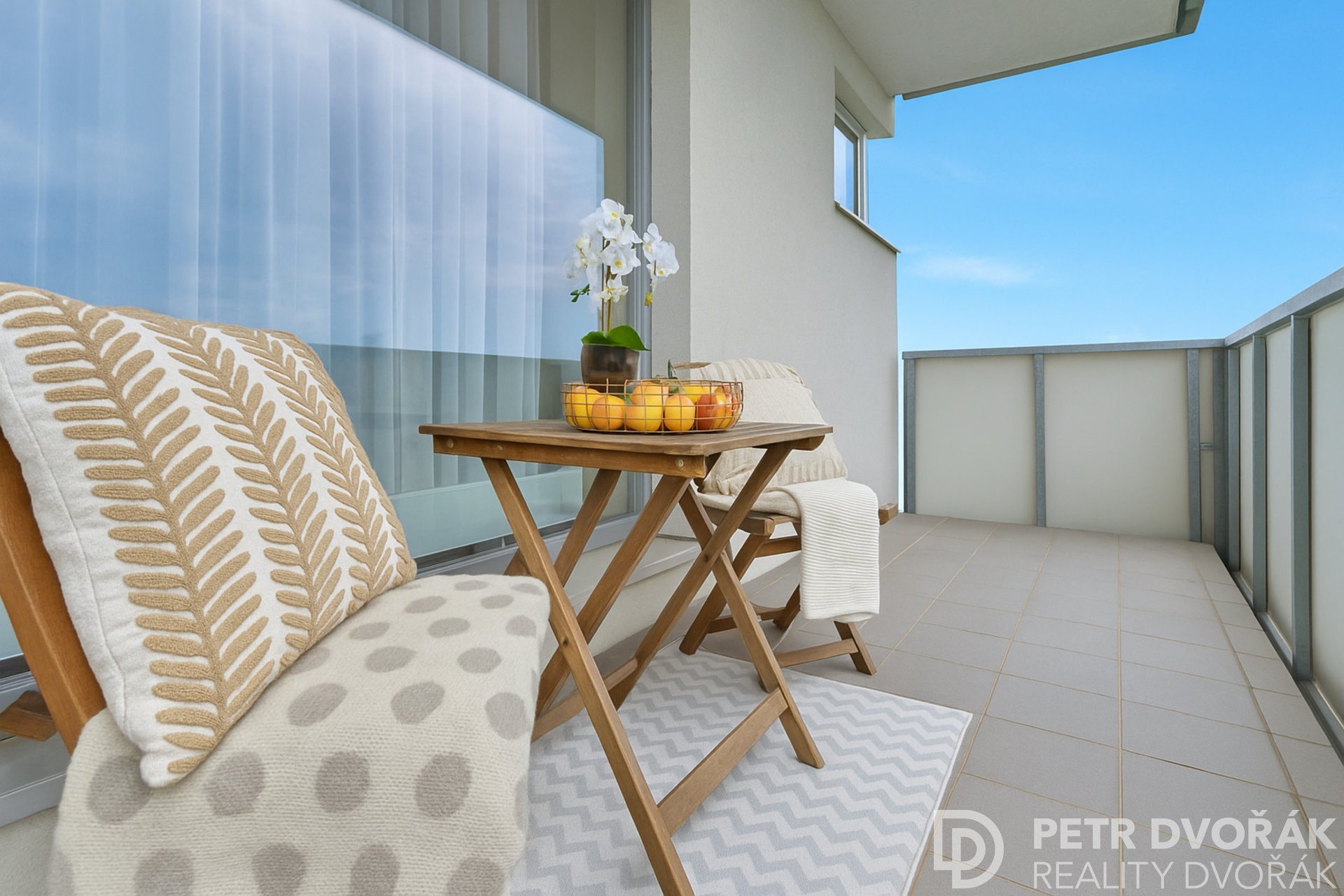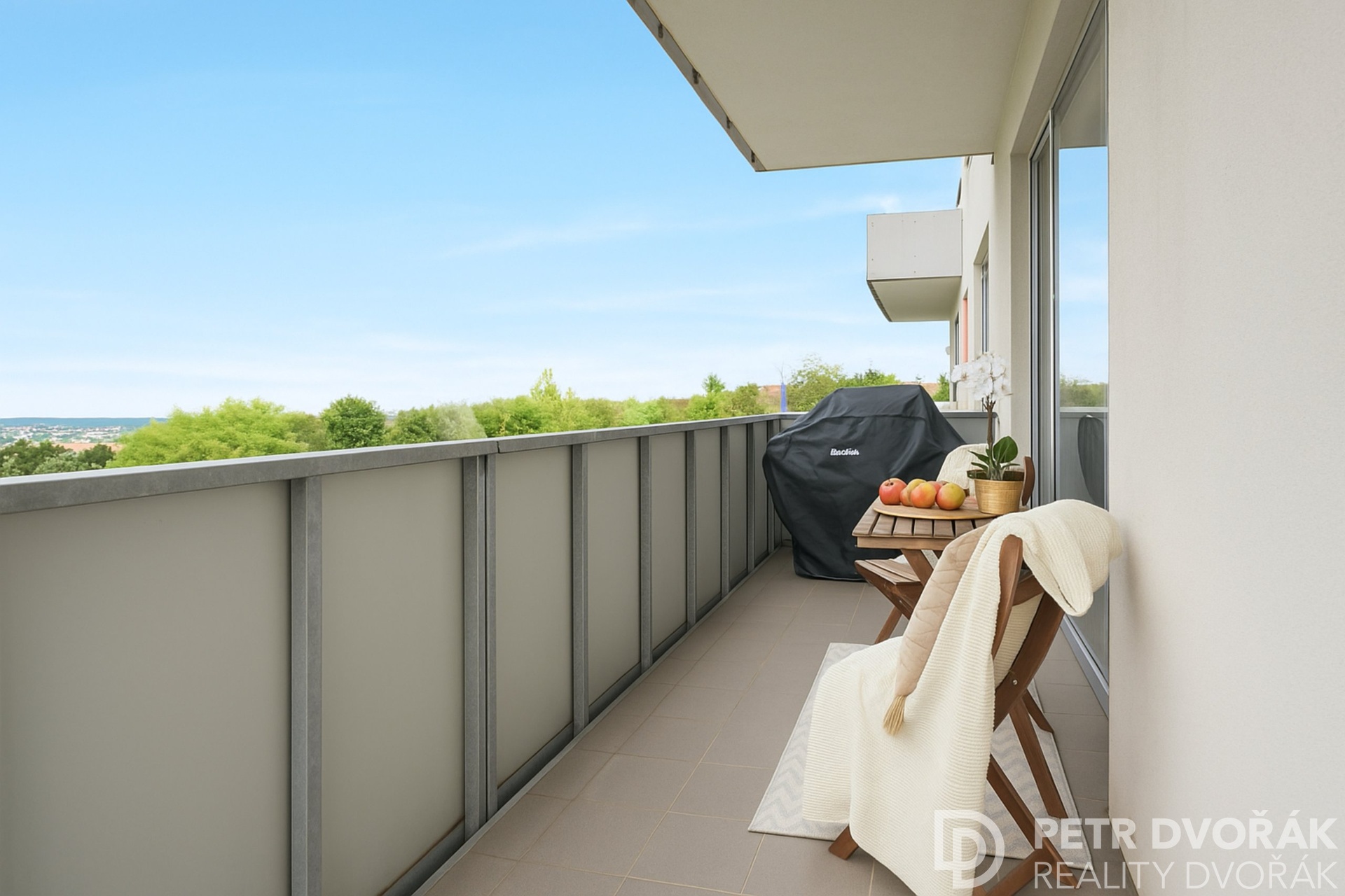 Velký balkón navazující na obývací pokoj poskytuje dostatek prostoru pro venkovní posezení i grilování, druhý balkón nabízí klidné místo k odpočinku.