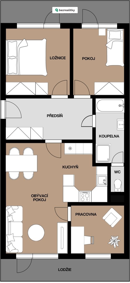 Dispozice bytu je prakticky řešena – obývací pokoj s kuchyňským koutem je orientován na jihozápad, což zajišťuje dostatek denního světla po většinu dne, zatímco ostatní pokoje jsou orientovány na severovýchod. Jedna z místností o velikosti 6,75 m² je vedena jako pracovna či komora a může skvěle posloužit jako domácí kancelář, šatna nebo úložný prostor. K bytu náleží hned dvě prostorné lodžie, každá o velikosti 7,9 m², které výrazně rozšiřují obytný prostor a nabízejí příjemné místo pro relaxaci. Další výhodou je samostatná komora o velikosti 1,3 m², umístěná na chodbě přímo naproti bytu a započítaná do podlahové plochy.