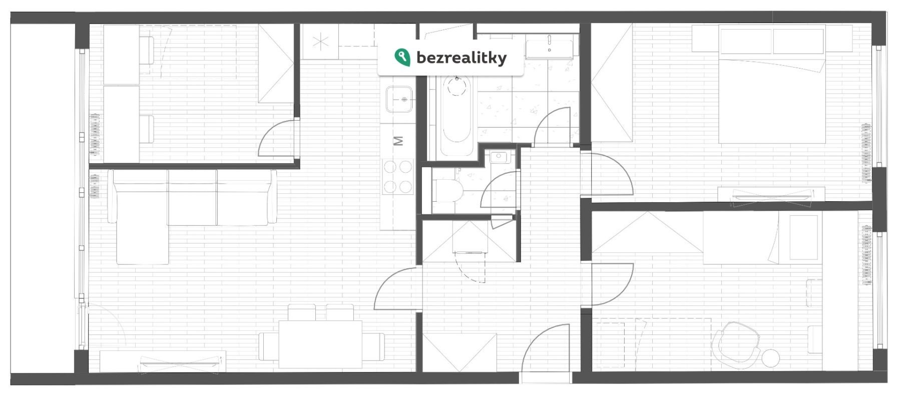 Dispozice bytu nabízí prostorný obývací pokoj s kuchyňským koutem a přístup na velkou zasklenou lodžii orientovanou do vnitrobloku, ložnici s místem pro velkou skříň, pokoj, dětský pokoj nebo pracovnu, samostatný záchod, koupelnu se záchodem vybavenou vanou a vstupní chodbu s vestavnou skříní. K bytu náleží lodžie o velikosti 6.8 m2 a sklepní kóje o velikosti 2.1 m². Byt je orientován na jihozápad s výhledem do zeleného vnitrobloku a severovýchod s výhledem na Centrální park.