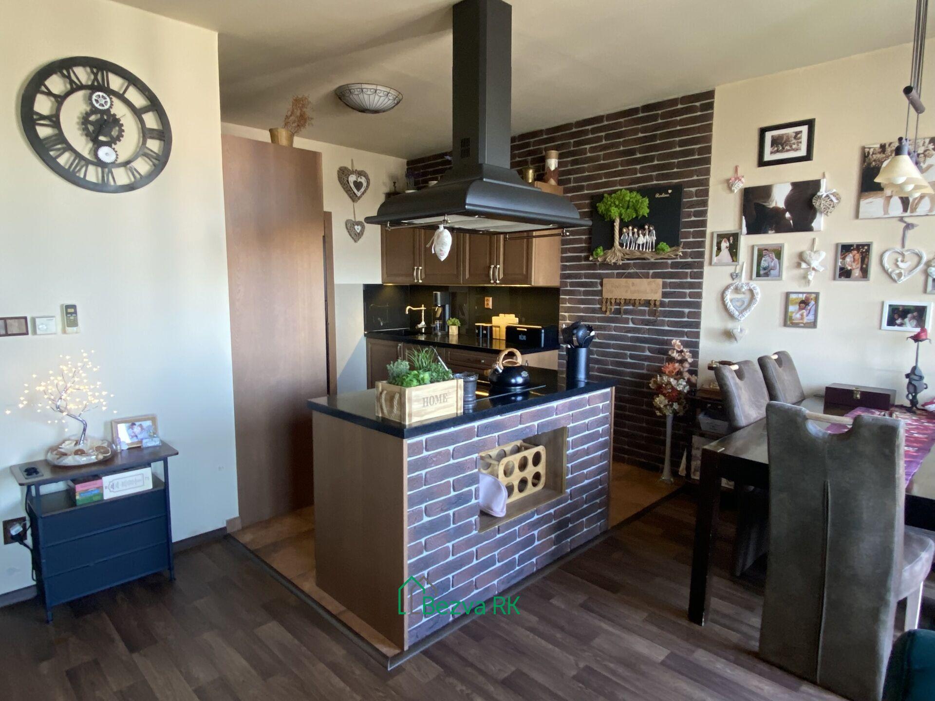 Srdcem bytu je spodní patro, kde se rodinný život odehrává v prosvětleném obývacím pokoji s kuchyňským koutem v poctivém dřevěném dekoru, který dodává prostoru hřejivý nádech a klid. Z obývacího pokoje můžete vyjít na balkon (8 m²), který je jako stvořený pro ranní rituály s šálkem kávy při východu slunce. Praktické zázemí doplňuje samostatné WC.