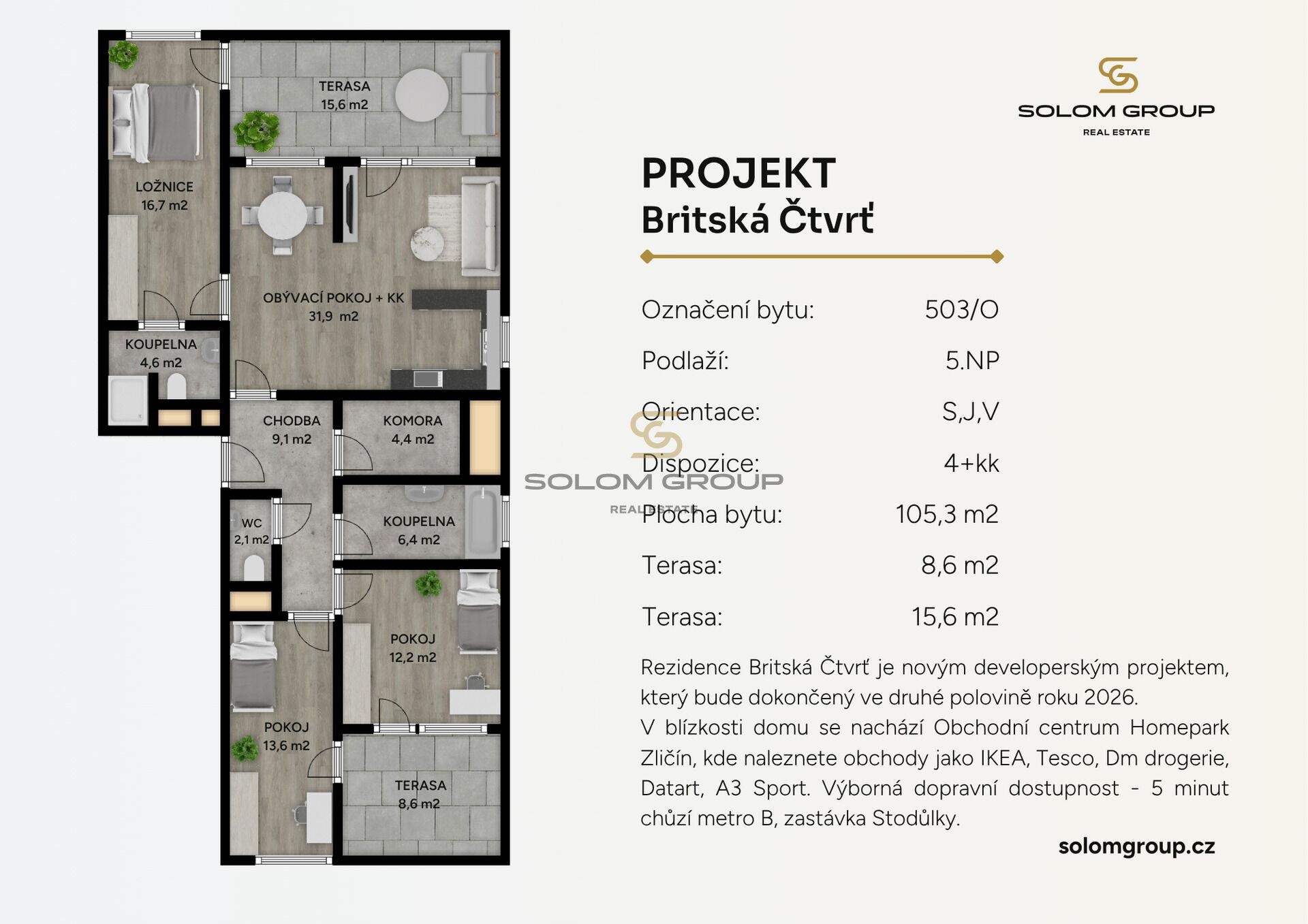 Prodej nového nadstandardního bytu 4+kk o výměře 105,3 m² s terasami 8,6 m² a 15,6 m², který se nachází v 5. NP cihlové novostavby v Rezidenci Britská čtvrť, Praha 12 – Stodůlky.