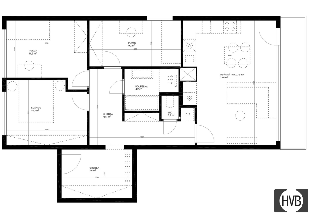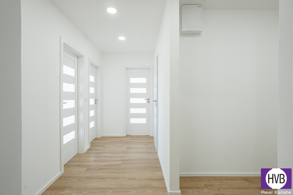 Dispozice: velmi prostorná vstupní chodba, obývací pokoj s plně vybavenou kuchyňskou linkou, tři obytné místnosti, koupelna a sprchový kout. Oddělené místo pro pračku a samostatné WC. Bydlení je navrženo s ohledem na moderní životní styl, vybaveno kvalitními materiály a promyšlenými detaily. Součástí bytu je také prostorná lodžie a sklep.