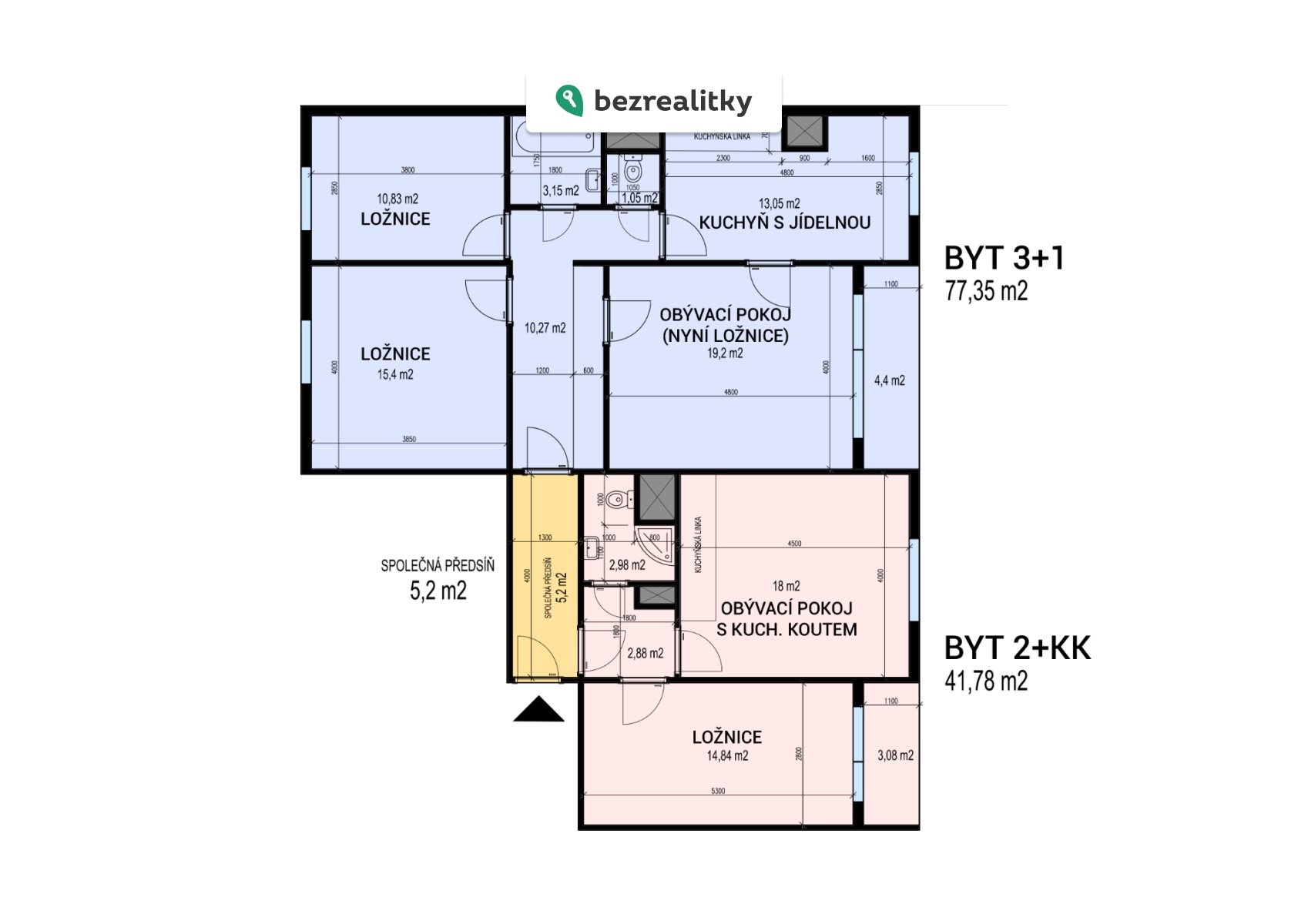 První bytová jednotka o dispozici 3+1 s plochou 77,35 m² nabízí prostorné a funkčně řešené bydlení s třemi pokoji, samostatnou kuchyní, koupelnou, odděleným WC a lodžií. Druhá bytová jednotka o dispozici 2+kk s plochou 41,78 m² je kompaktní, plně využitelná a zahrnuje obytný prostor s kuchyňským koutem, samostatný pokoj, koupelnu s WC a vlastní lodžii. Obě jednotky jsou přístupné přes společné zádveří, které zajišťuje jejich praktické oddělení. K bytové jednotce dále náleží sklepní kóje o velikosti cca 3,5 m² umístěná v 1. podzemním podlaží domu.