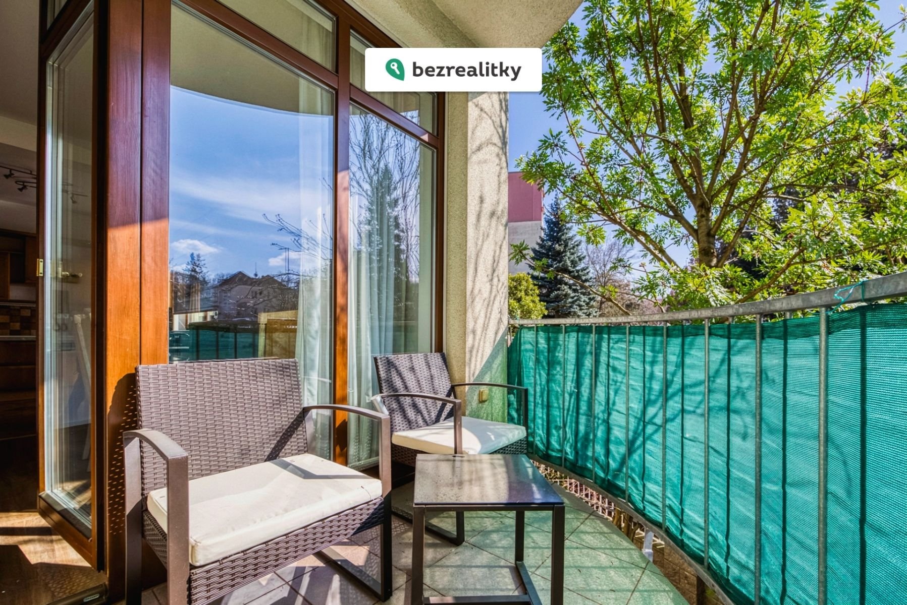 K bytu náleží upravená předzahrádka 123 m2 se vzrostlou zelení a kvetoucími stromy, doplněná automatickým zavlažovacím systémem — ideální místo pro relaxaci v soukromí.