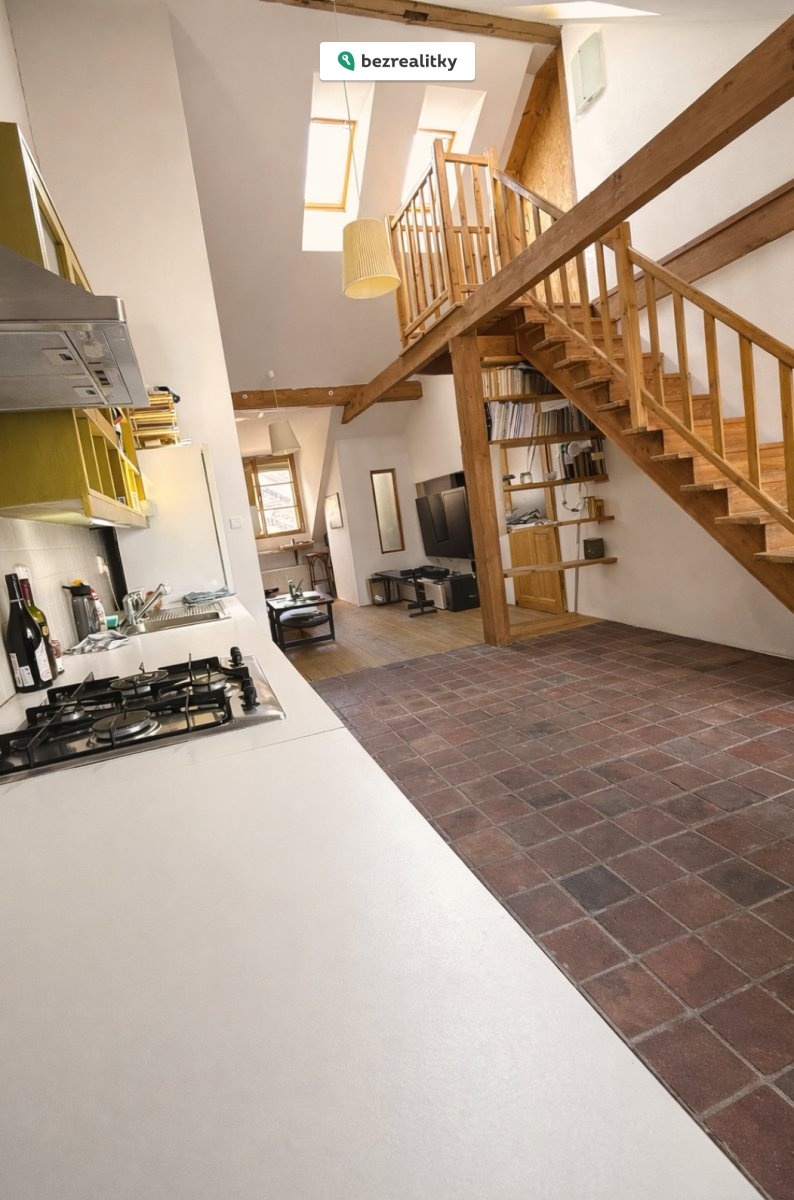 K bytu patří střešní terasa o výměře 14 m², jižně orientovaná, s výhledem přes střechy Nuslí a okolní zeleň — absolutní unikát tohoto bytu. Vstupní chodbou s hexagonální dlažbou vejdete do hlavního obytného prostoru s kuchyňským koutem. Dřevěné trámy, střešní okna, dřevěné schodiště vedoucí do horního patra a světlá výška stropu až 4,5 metru dodávají prostoru jedinečný podkrovní charakter. Na obytný prostor navazuje ložnice s vestavěnou šatnou. Koupelna s vanou i sprchovým koutem a samostatné WC doplňují dispozici. Z obývacího pokoje vede dřevěné schodiště do horní úrovně — podkrovního pokoje s prosklenými francouzskými dveřmi, které vedou přímo na terasu. V horním patře se nacházejí také dodatečné úložné prostory. Součástí je sklep v suterénu domu (8 m²). Byt prošel částečnou rekonstrukcí v roce 2017.