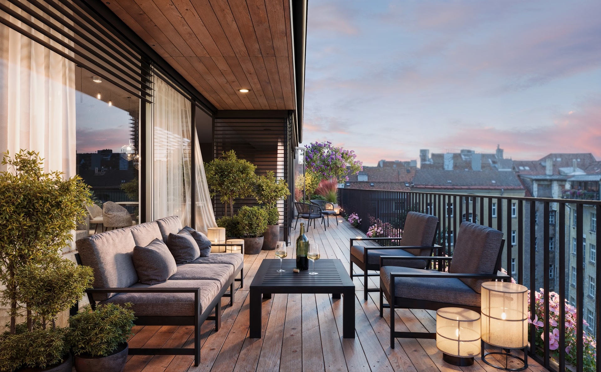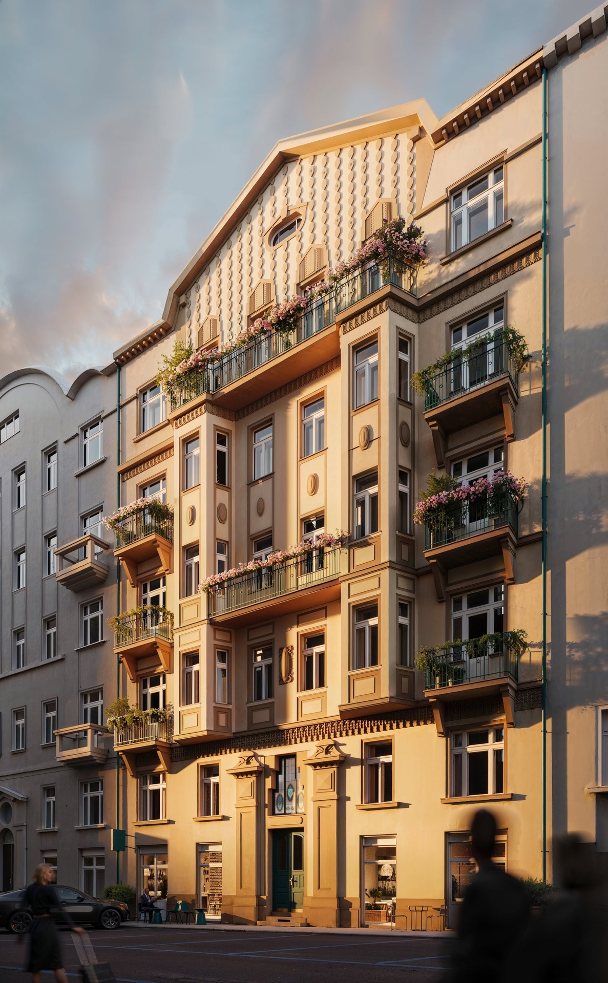 Půdorys jednotky v 7. a 8. podlaží zahrnuje prostorný obývací pokoj s přípravou na kuchyňský kout, velkorysou ložnici se vstupem na terasu a vlastní koupelnou, dvě další ložnice, pracovnu, koupelnu s vanou, samostatnou toaletu, praktickou komoru a chodbu s dostatkem místa na vestavěné skříně. K jednotce náleží také terasa o velikosti 33,2 m² a sklepní kóje o 3,8 m². Provedení white wall umožňuje interiér doladit přesně podle vašich představ. Elegantní bytový dům po kompletní rekonstrukci společných prostor nabídne materiály jako terazzo, broušené sklo či benátské štuky, které doplní moderní bezpečnostní dveře a nový prosklený výtah. K dispozici je také upravený vnitroblok a pro maximální komfort rezidentů i sauna.