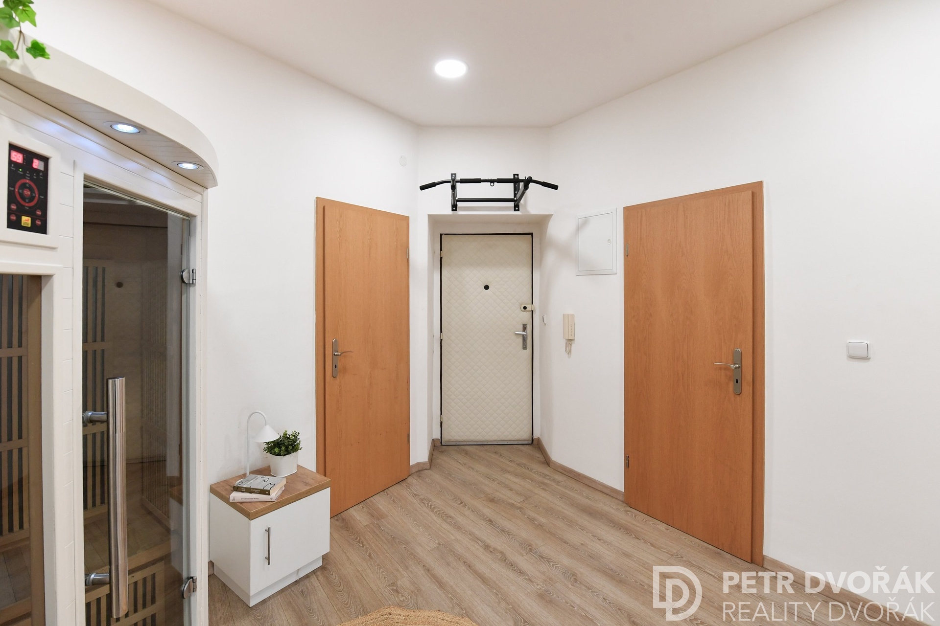 Vstupní předsíň s novou plovoucí podlahou nabízí dostatek úložného prostoru a praktickou komoru / šatnu. Součástí předsíně je i neobvyklý bonus – vlastní infrasauna pro regeneraci v soukromí domova. Samostatná kuchyň disponuje moderním vybavením a pohodlným prostorem jak pro vaření, tak pro každodenní stolování. Obývací pokoj zaujme množstvím přirozeného světla a renovovanými parketami, které dodávají interiéru teplý a nadčasový charakter. Ložnice se dvěma okny poskytuje klidné zázemí s výhledem do dálky. Třívrstvá komorová okna v celém bytě zajišťují vynikající tepelnou i hlukovou izolaci. Koupelna s vanou a pračkou je obložena novou dlažbou a obklady, toaleta je řešena samostatně.