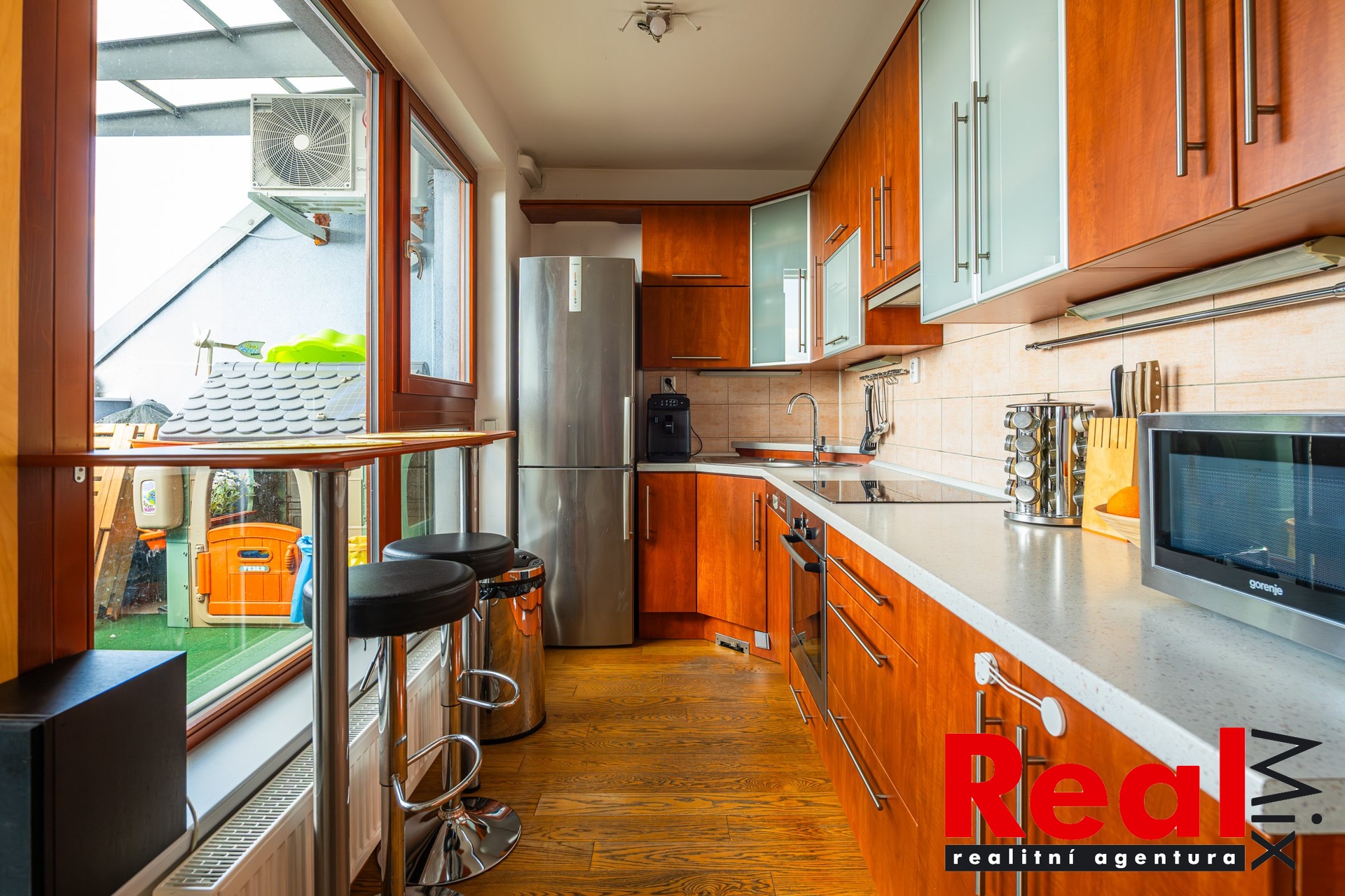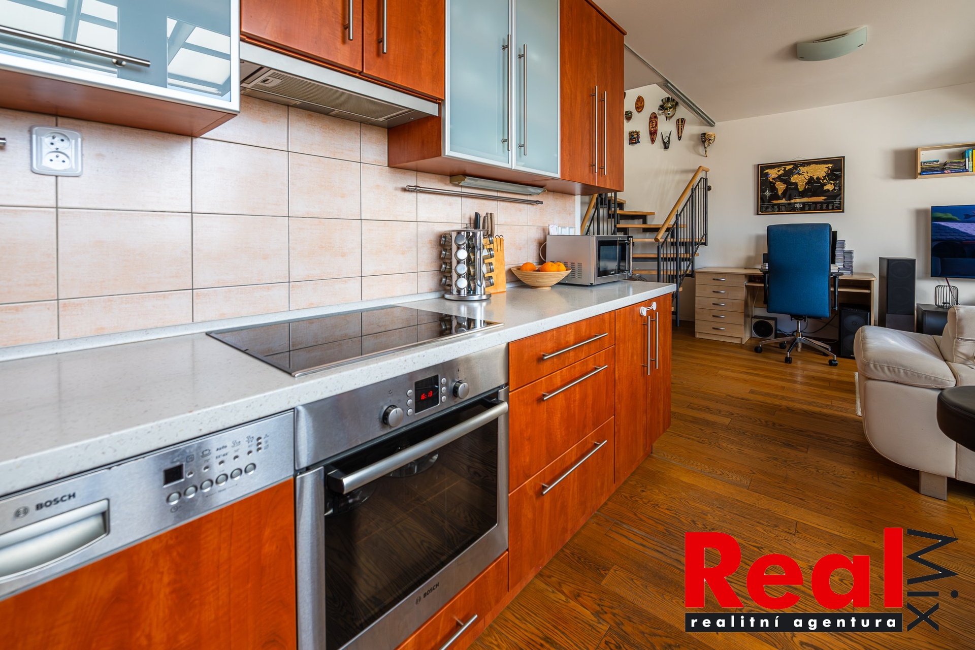 Nabízíme prodej velmi pěkného bytu 3+KK s menší terasou, garážovým parkovacím stáním a zděným sklepem, ulice Starochodovská, Praha 11 - Chodov. Bytový dům se nachází v klidné a příjemné lokalitě zástavby rodinných domů starého Chodova a je obklopen množstvím zeleně i dostatečným počtem parkovacích míst. Celková plocha bytu činí 92m2. Jedná se o mezonetový byt ve 4. a 5. patře bytového domu z roku 2008 a jeho celková podlahová plocha činí 92m2 + garážové stání. Výměra samotné bytové jednotky činí 82m2, k tomu prostorný zděný sklep 4m2 a menší terasa 6m2, bytový dům má výtah a je v perfektně udržovaném stavu. Dispozice bytu: v 1. podlaží bytu se nachází vstupní předsíň, koupelna se sprchovým koutem a WC, prostorný obývací pokoj s kuchyňským koutem a výstupem na terasu, otevřené schodiště do 2. podlaží, ve 2. podlaží se pak nachází galerie s možností úpravy např. na menší pracovnu či knihovnu, druhá koupelna (s vanou, WC a prostorem na pračku i sušičku) a dvě samostatné ložnice. Z větší ložnice je přístupná i praktická šatna. Bytová jednotka je vybavena kuchyňskou linkou včetně veškerých vestavěných spotřebičů. Dále je byt zařízen vestavěnými skříněmi ve všech místnostech (3 x pokoj, předsíň) a klimatizací v obývacím pokoji a ložnici. Obývací pokoj je příjemně prosvětlený prosklenou stěnou na terasu. Velkou výhodou bytu je garážové parkovací stání a zděný sklep, který se nachází přímo vedle parkovacího místa. V blízkosti domu naleznete kompletní občanskou vybavenost, supermarket, nákupní centrum Chodov, školky, základní škola atd., dostupnost do centra max. 30 minut (stanice metra Chodov či Opatov). Cena je uvedena vč. provize RK a všech poplatků. Uvolnění bytu léto 2026. Více info a prohlídky v RK.