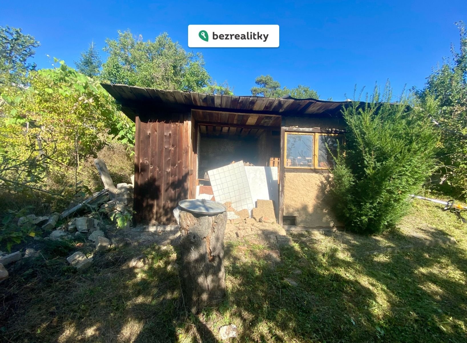 Ve spodní části pozemku je podružná stavba (suché WC a kůlna), která v posledních letech nebyla využívána a udržována a je tedy k rekonstrukci či demolici. Není to akutní, je to samostatná stavba a nemá vliv na zbytek pozemku a chatu.