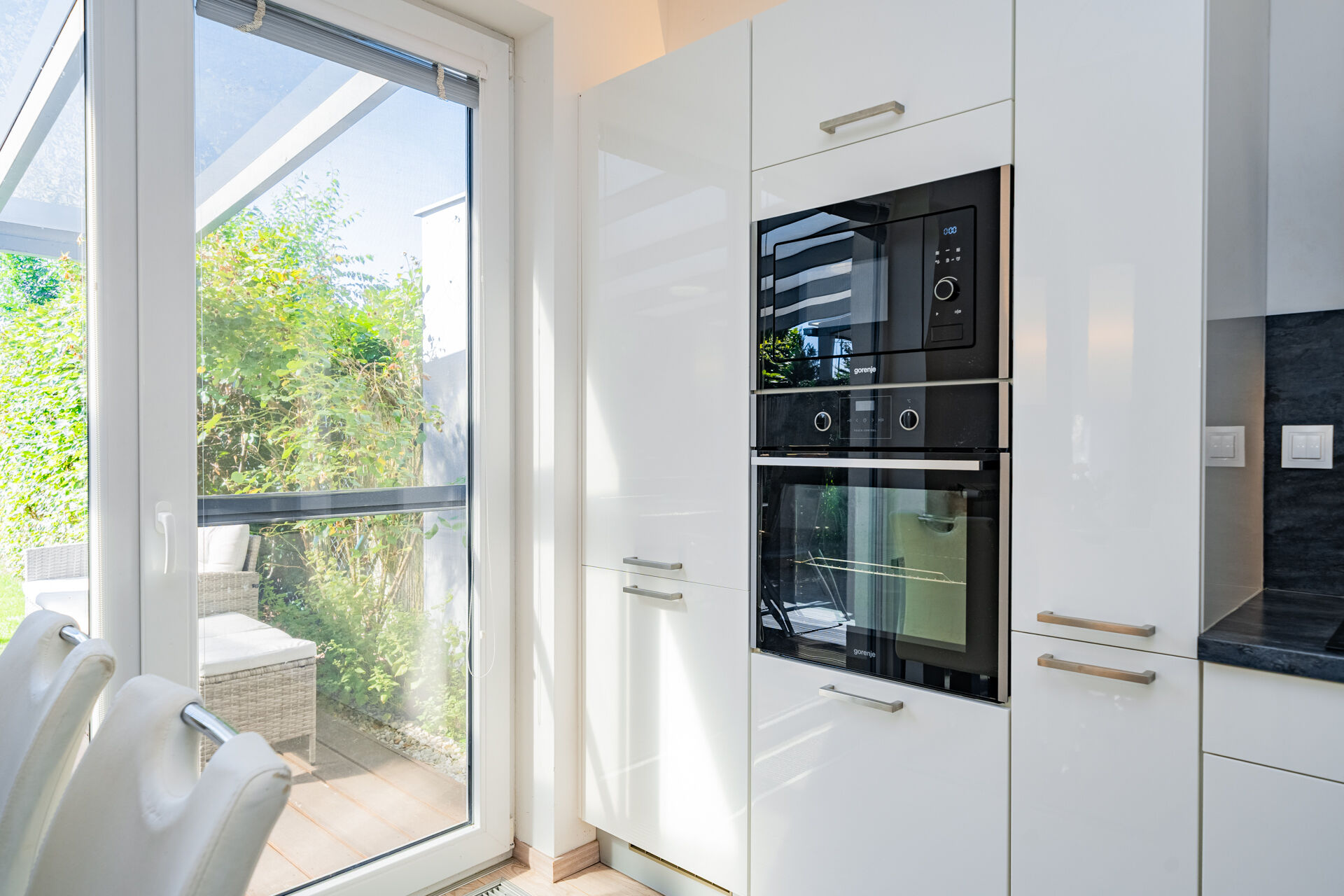 V přízemí domu je obývací pokoj s jídelnou, kuchyní, vstupem na terasu domu a dále do zahrady. Kuchyňská linka je vybavena spotřebiči ( varná deska, digestoř, trouba, mikrovlnná trouba, myčka nádobí, lednice, mrazák). Garáž domu je přístupná vraty na dálkové ovládání a je prakticky propojena dveřmi s interiérem domu, což poskytuje pohodlí v rámci nákupů a umožňuje jednoduché využití garáže v rámci úložného prostoru. V přízemí domu je vstupní chodba, koupelna se sprchou a toaletou. Patro domu má tři samostatné pokoje. V ložnici jsou vestavné skříně. Pokoje je možno využít dle vlastní potřeby, jako dětské pokoje, ložnice či pracovnu. V patře domu je další koupelna se sprchovým koutem a vanou. Toaleta je zde samostatná. V domě jsou předokenní žaluzie. Zahrada domu je velmi pečlivě udržovaná, rovinatá, zatravněná se vzrostlými stromy, dřevinami. Za zmínku stojí také maliny a rybíz. Zahrada má jednoduchý systém zavlažování. Výhodou je úložný domeček a především zastřešená terasa domu, která svým využitím reálně zvětšuje plochu domu.