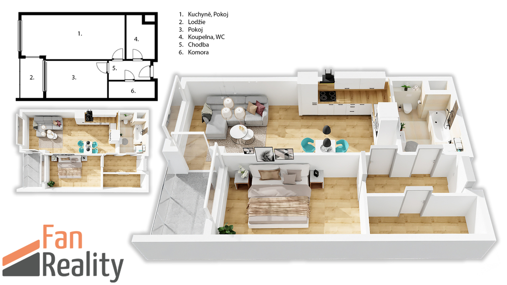 Dispozici tvoří obývací pokoj s kuchyňským koutem, samostatná ložnice, koupelna s vanou, vstupní chodba, komora a lodžie vhodná pro příjemné posezení.