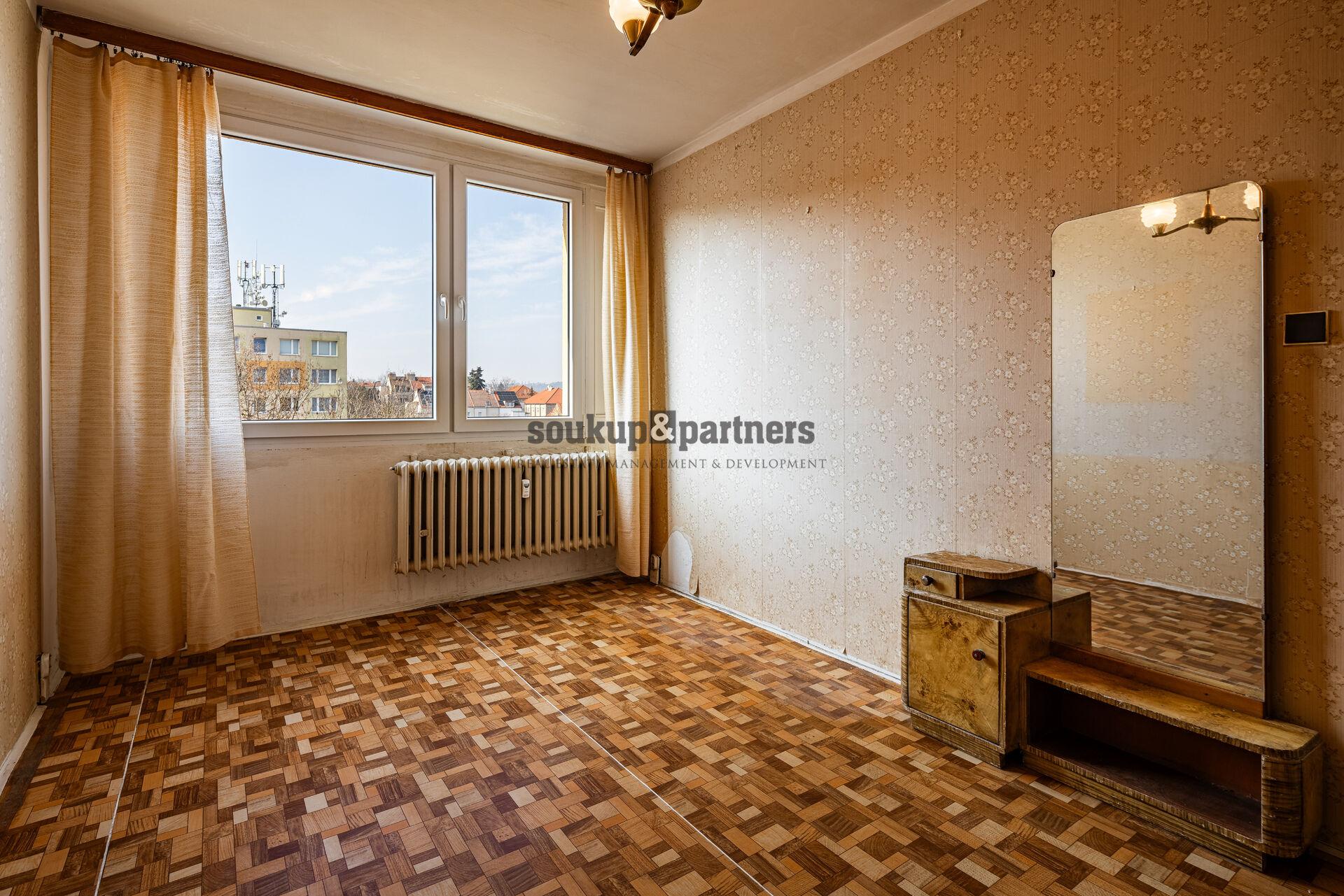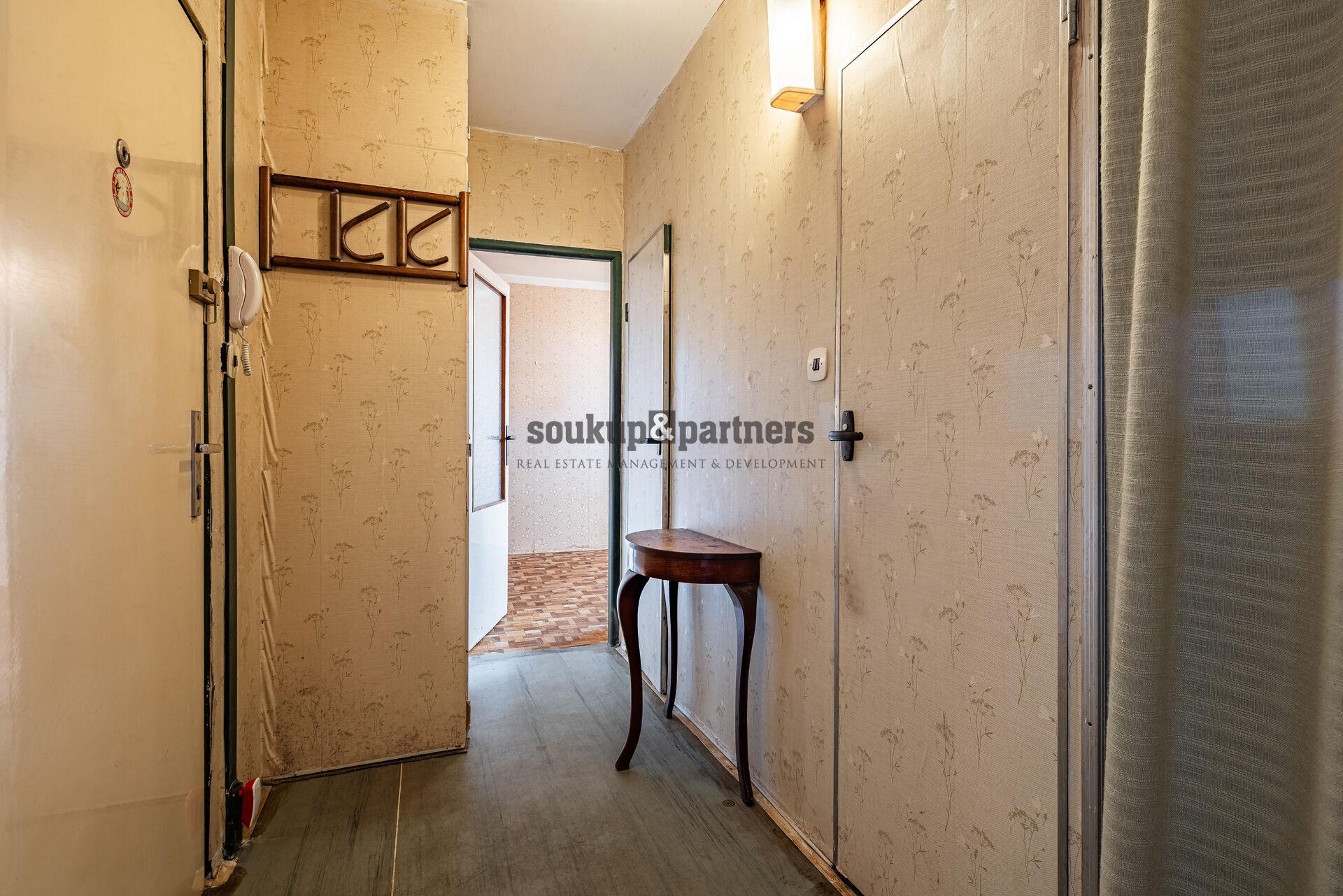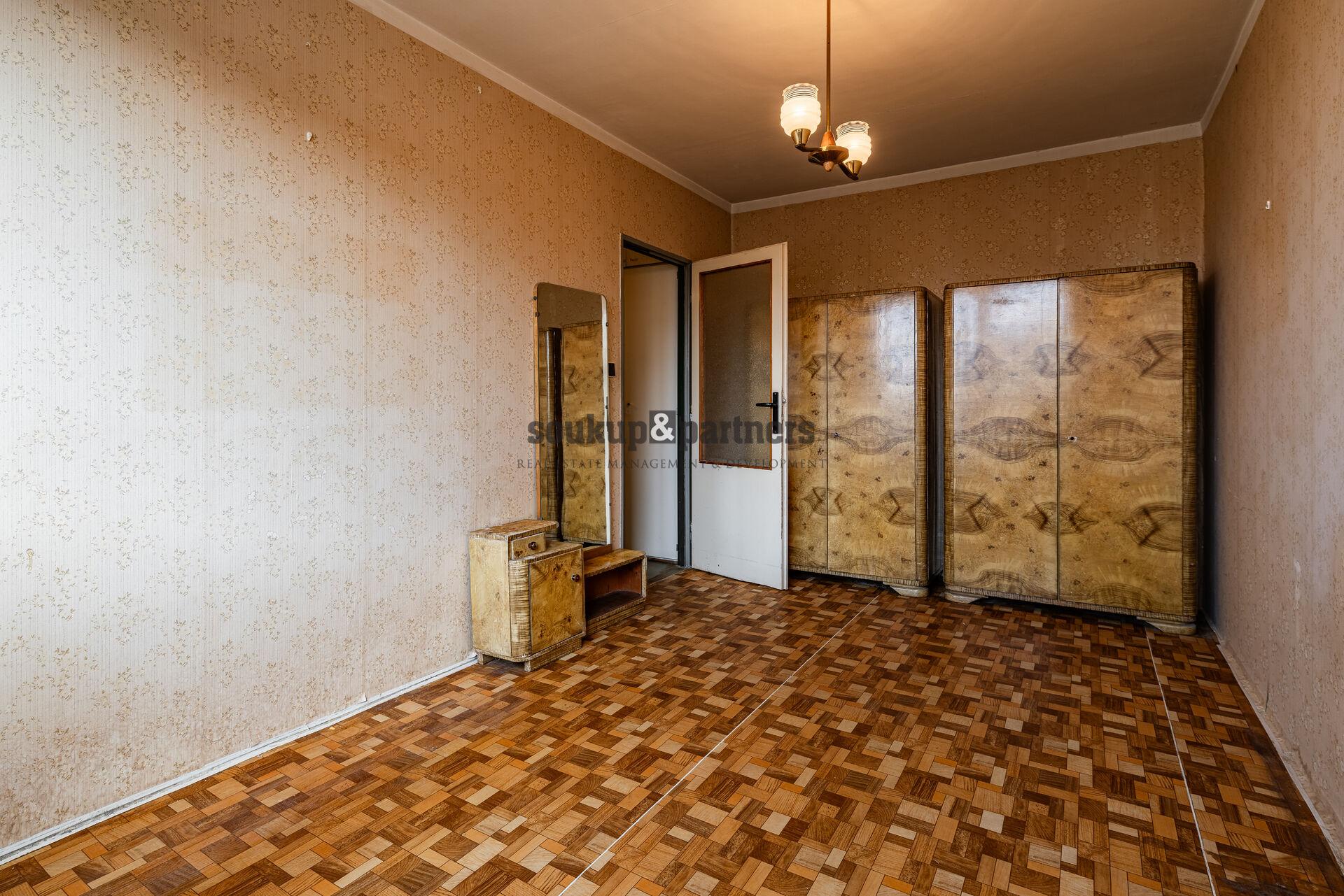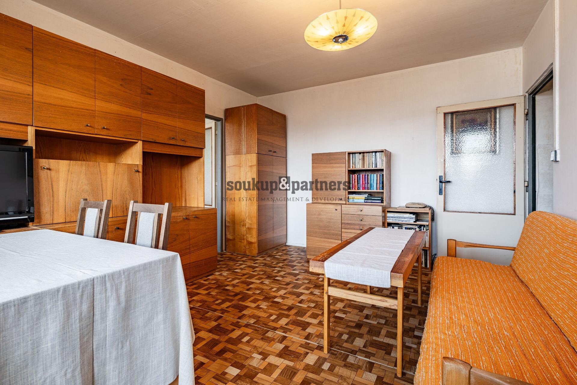 Dispozice bytu je velmi praktická. Z centrální chodby jsou přístupné jednotlivé místnosti – obývací pokoj se vstupem na lodžii, dvě samostatné ložnice, kuchyň, koupelna a samostatné WC. Byt je v původním stavu a nabízí tak ideální příležitost vytvořit si bydlení přesně podle vlastních představ. Nachází se zde původní kuchyňská linka, umakartové jádro a původní elektroinstalace, které budou pravděpodobně součástí budoucí rekonstrukce. Výhodou je, že okna v bytě již byla vyměněna za plastová, v obývacím pokoji jsou navíc dřevěná eurookna. K bytu dále náleží také sklepní kóje o velikosti 0,9 m².
