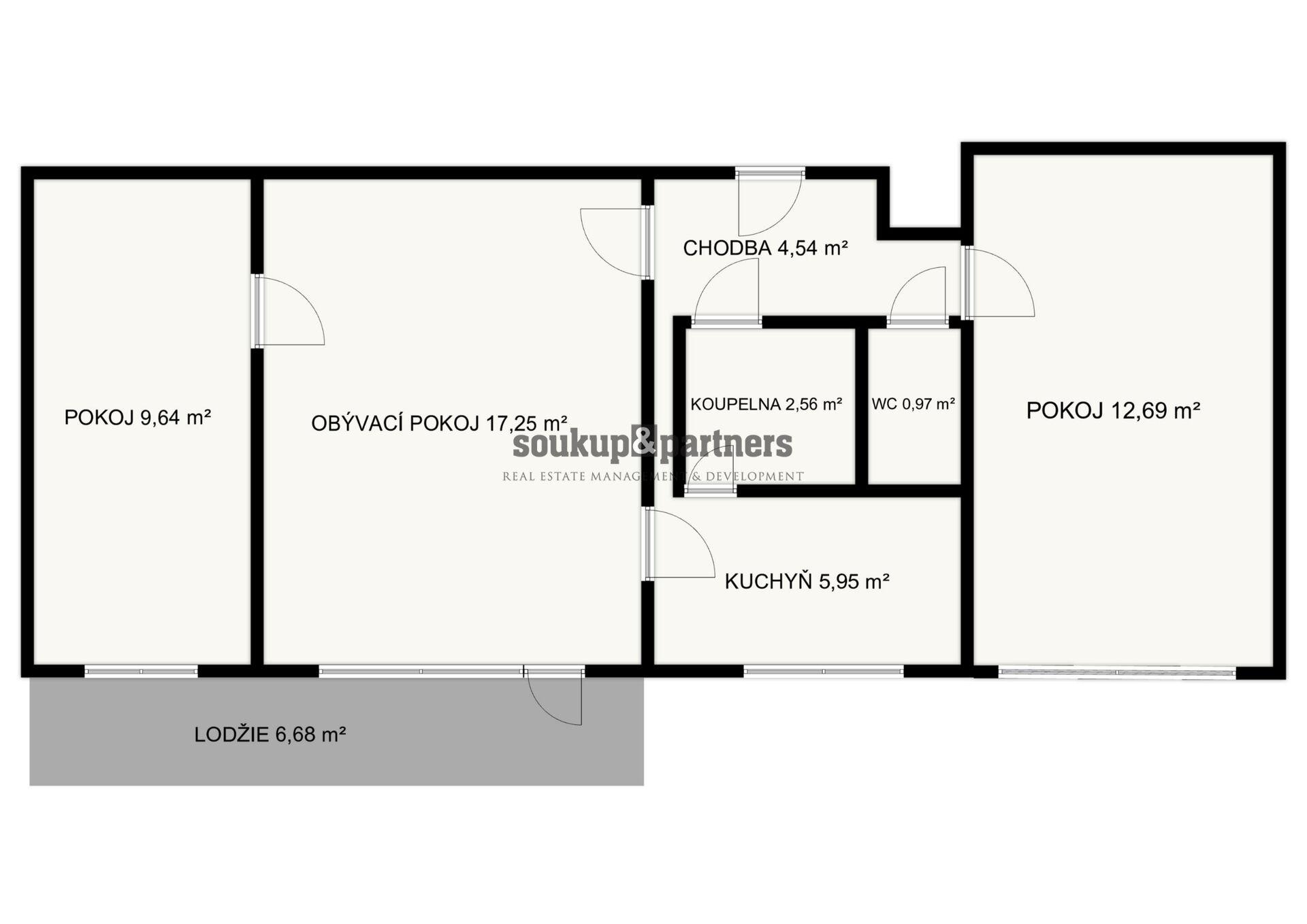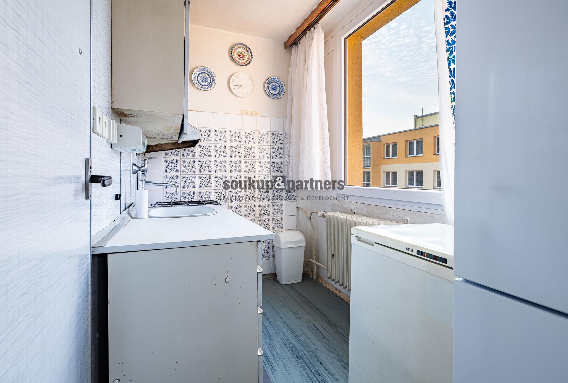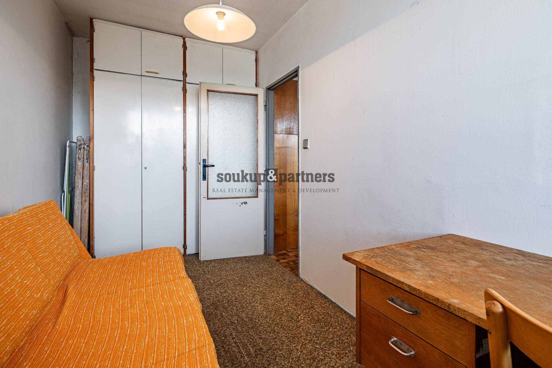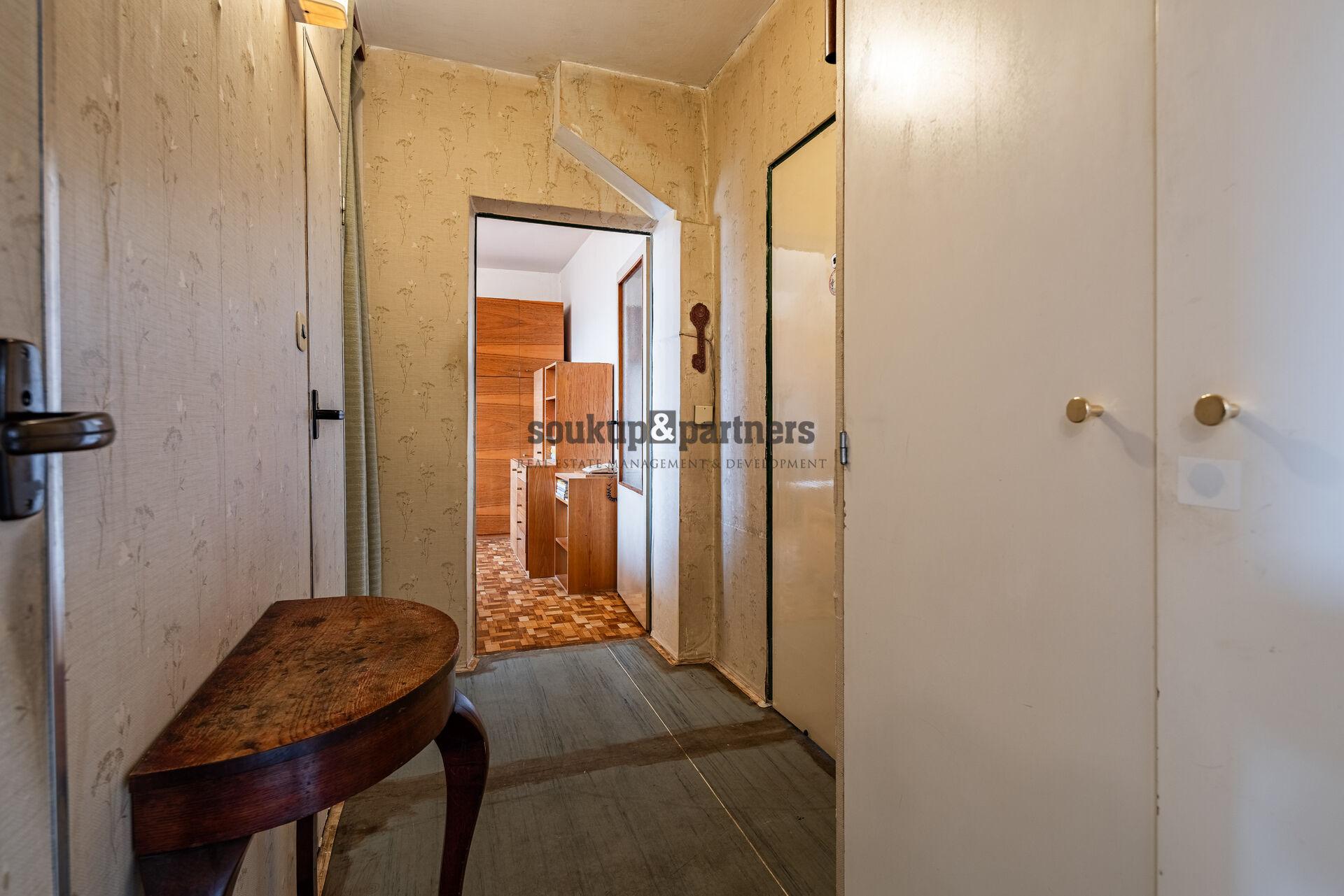 Dispozice bytu je velmi praktická. Z centrální chodby jsou přístupné jednotlivé místnosti – obývací pokoj se vstupem na lodžii, dvě samostatné ložnice, kuchyň, koupelna a samostatné WC. Byt je v původním stavu a nabízí tak ideální příležitost vytvořit si bydlení přesně podle vlastních představ. Nachází se zde původní kuchyňská linka, umakartové jádro a původní elektroinstalace, které budou pravděpodobně součástí budoucí rekonstrukce. Výhodou je, že okna v bytě již byla vyměněna za plastová, v obývacím pokoji jsou navíc dřevěná eurookna. K bytu dále náleží také sklepní kóje o velikosti 0,9 m².