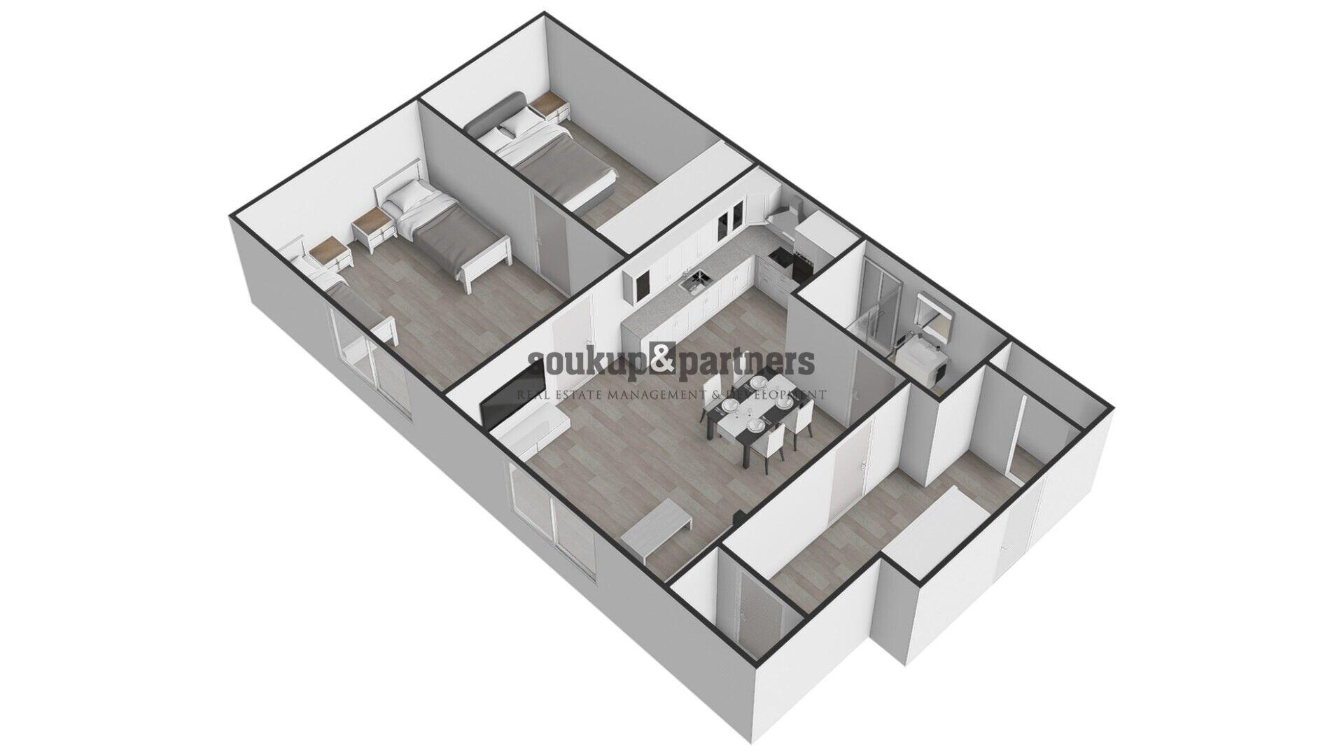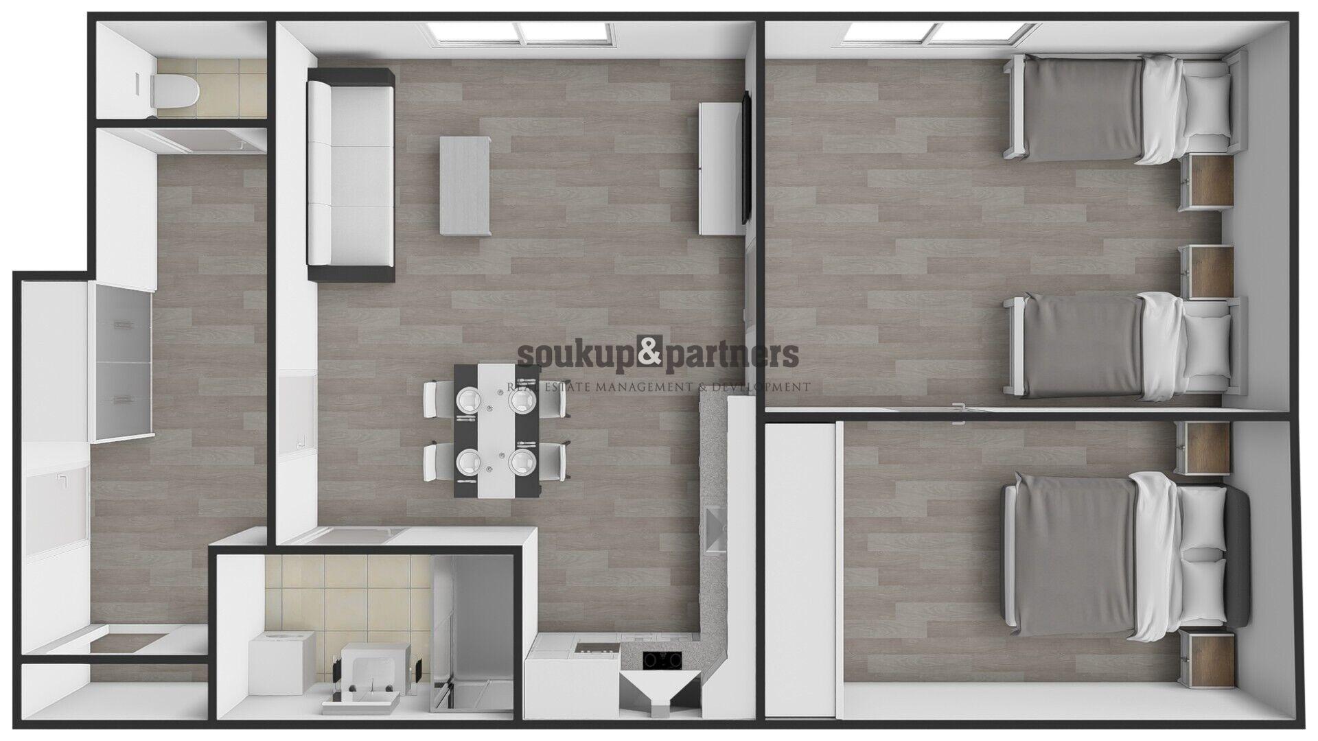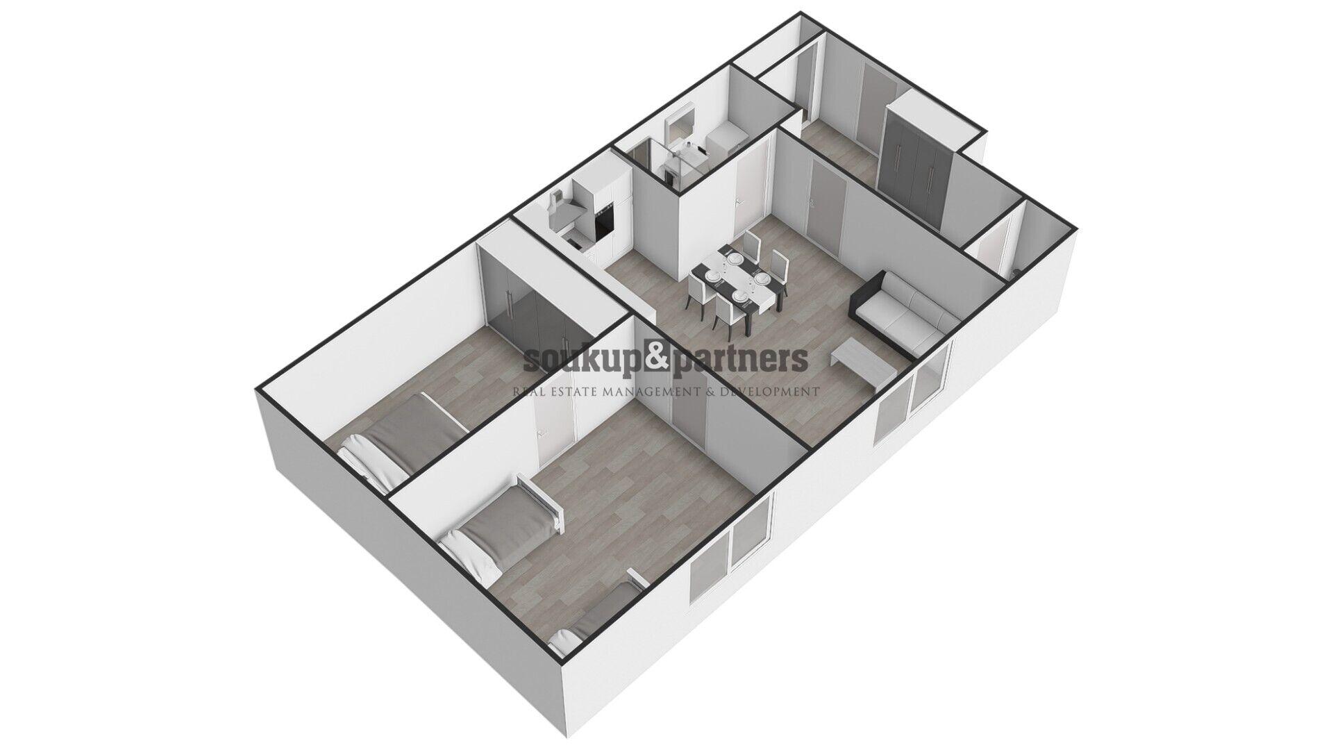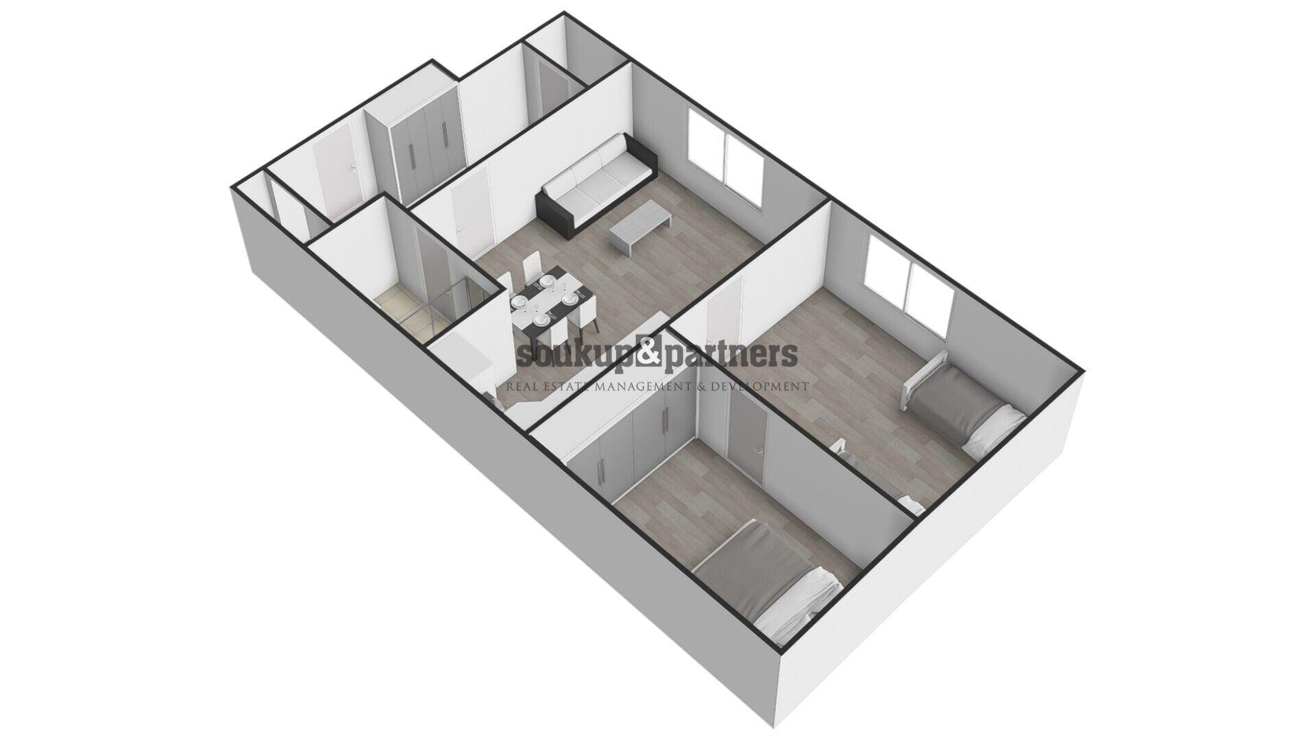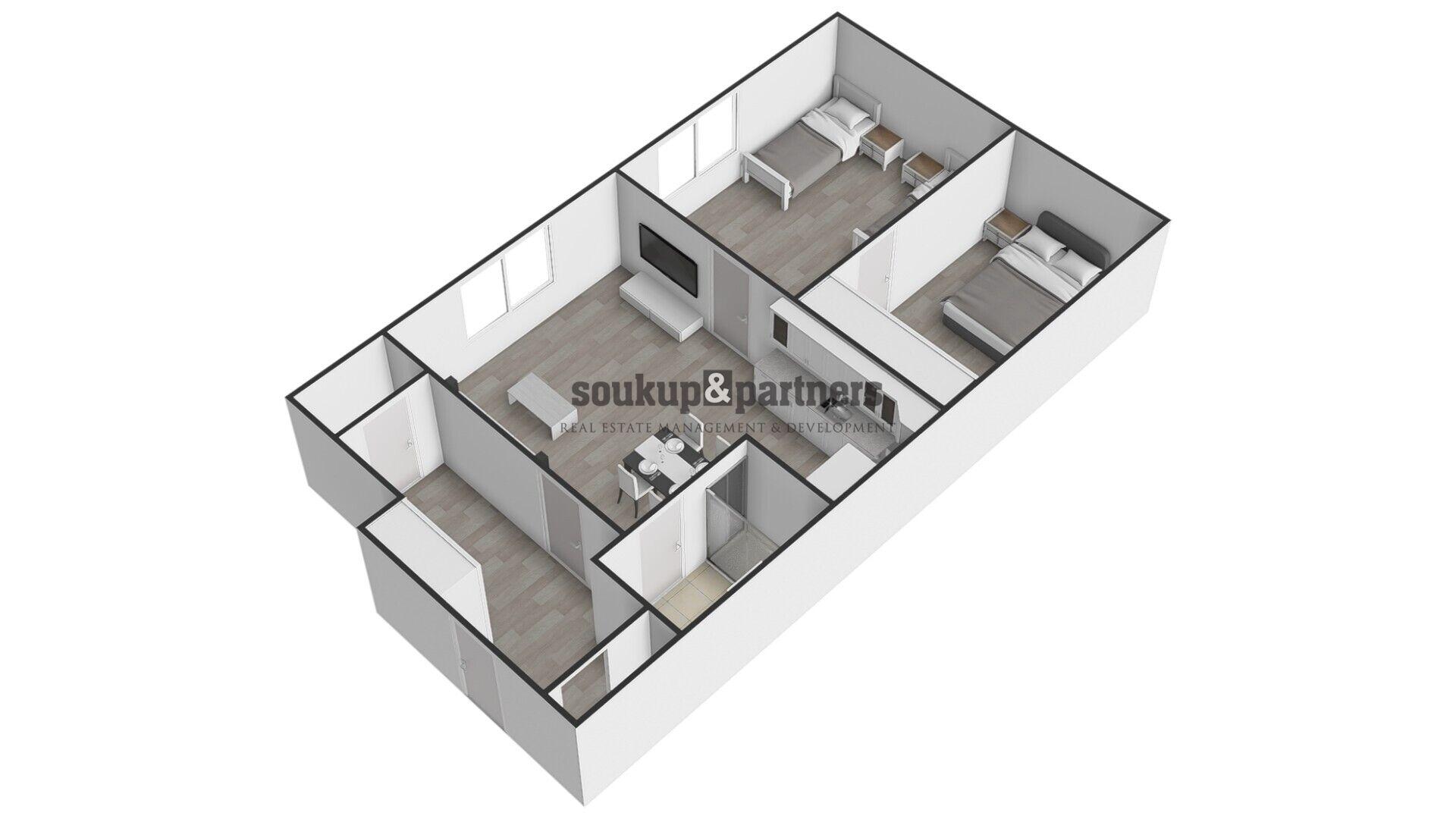 Dispozice bytu umožňuje využití jako 3+kk. Hlavní obytný prostor tvoří obývací pokoj s kuchyňským koutem. Dále je zde samostatná místnost s oknem a třetí pokoj o velikosti cca 8 m², vhodný jako pracovna, ložnice či šatna. Součástí je vstupní chodba se samostatným WC a koupelna se sprchovým koutem. Dispozice je praktická a dobře využívá celkovou plochu bytu.