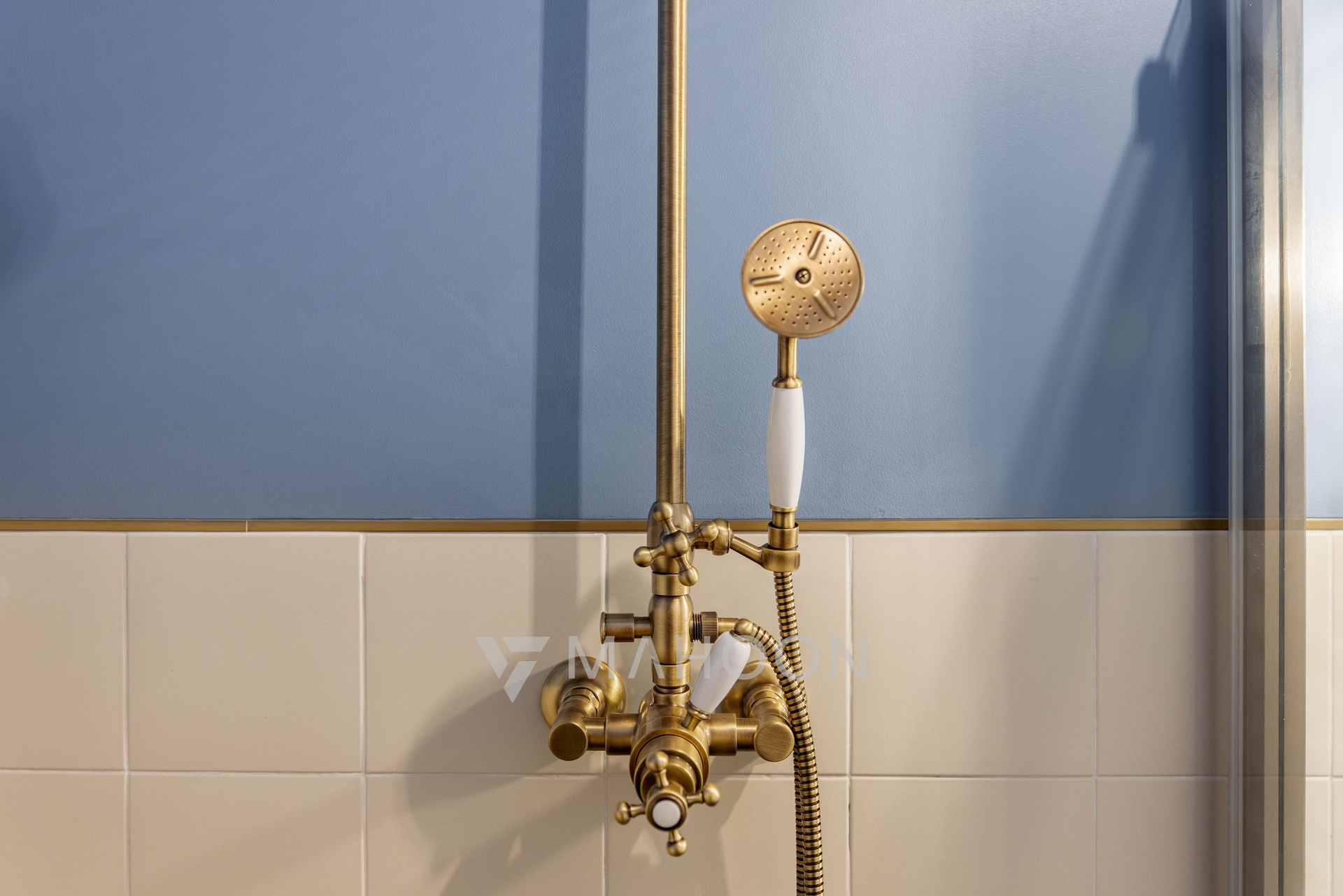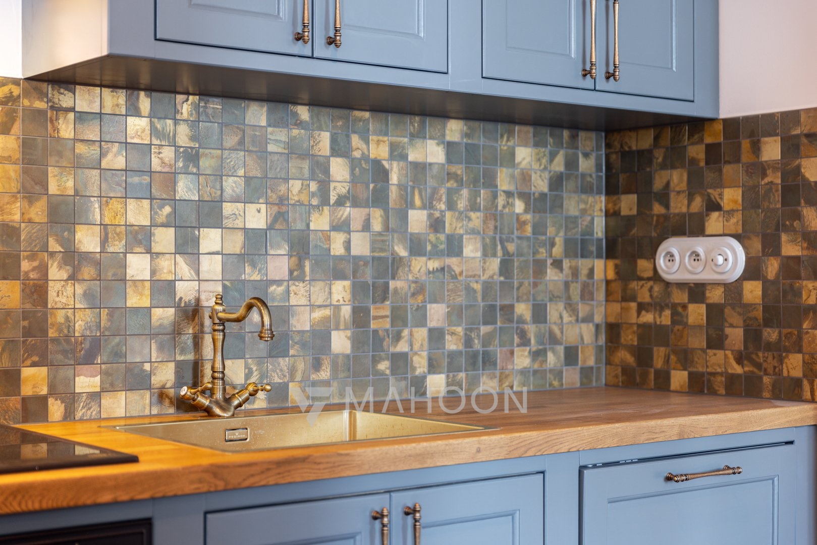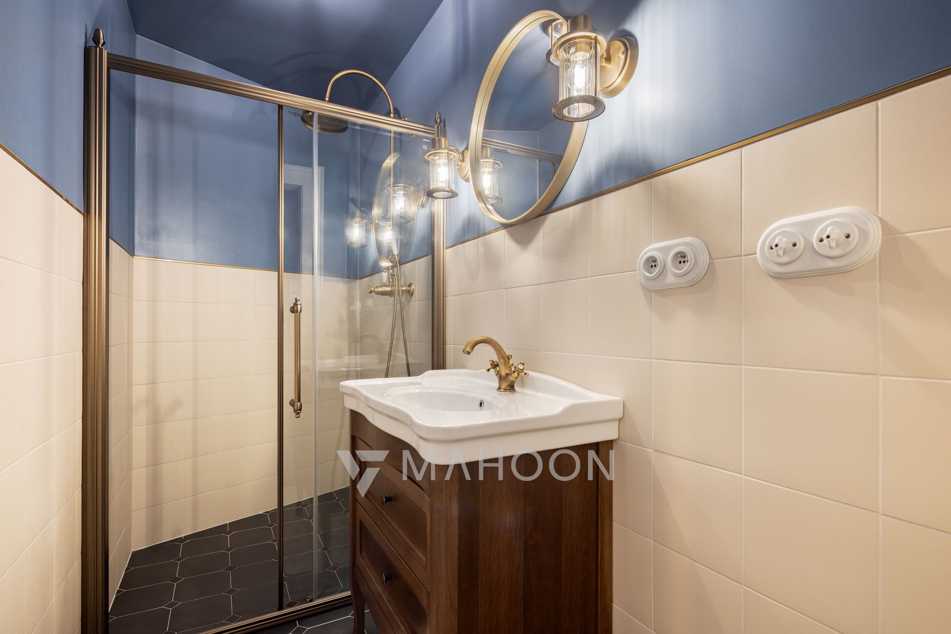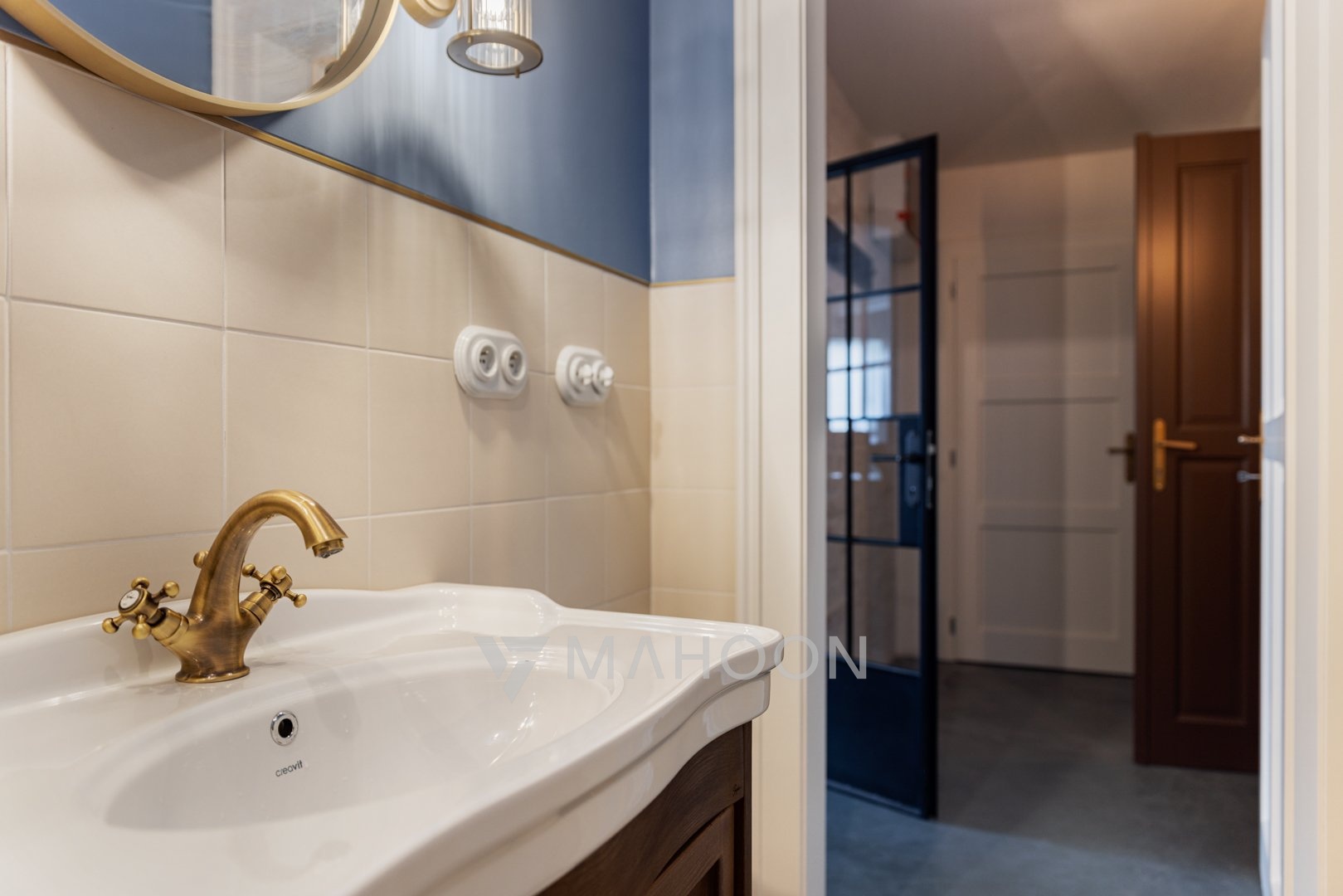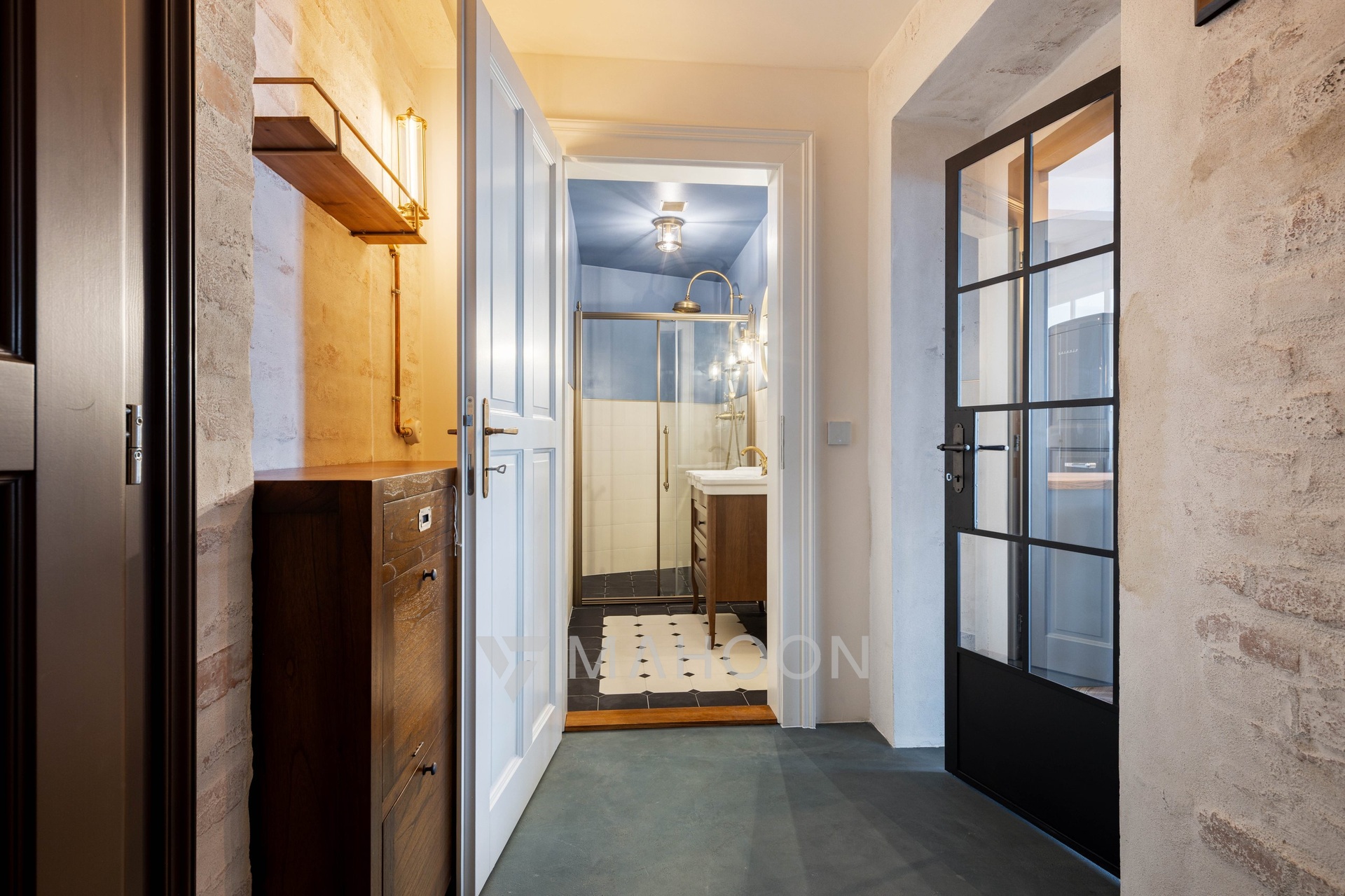 Originální kuchyňská linka je vyrobena z dubového masivu a vybavena je spotřebiči značky SMEG. Obdobná úroveň kvality je patrná i v koupelně, která je obložena slinutou italskou dlažbou a obklady, přičemž sanita a doplňky jsou v mosazi, to vše s důrazem na dlouhou životnost celé koupelny, která kromě unikátního designu nabízí také podlahové vytápění.