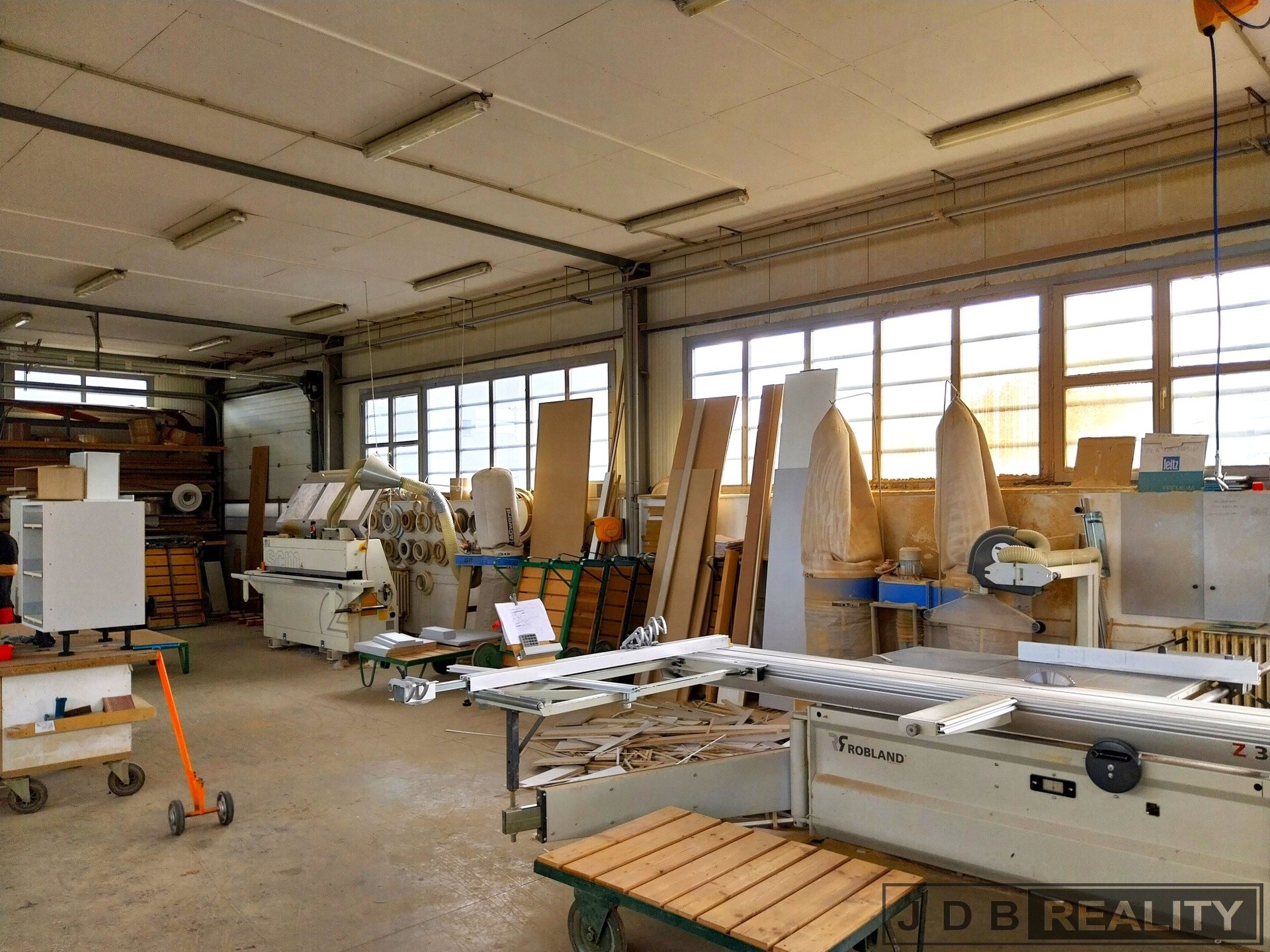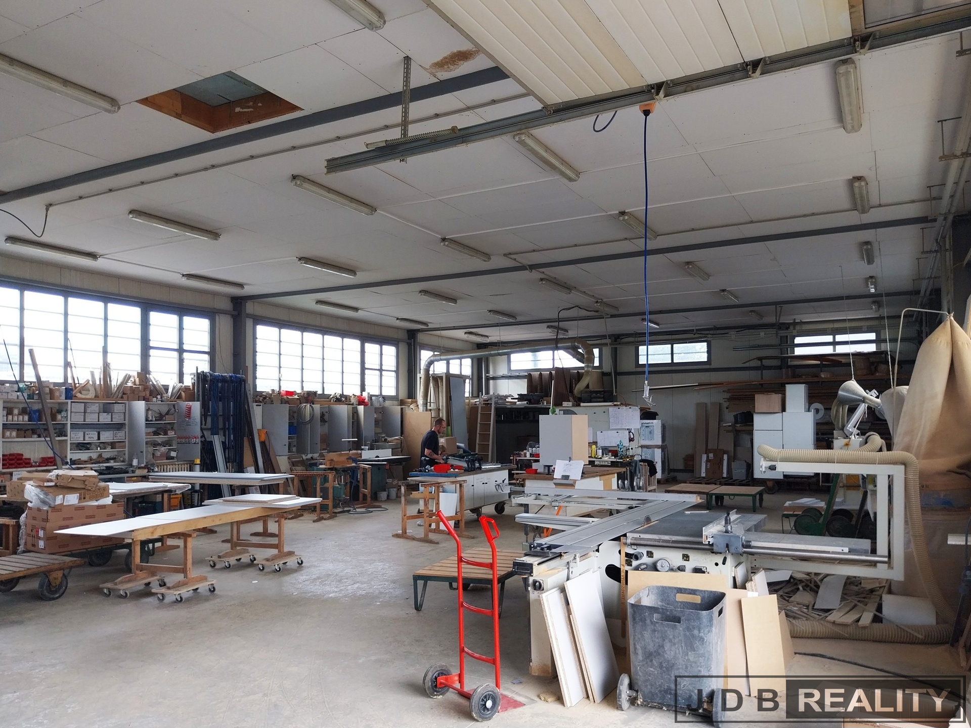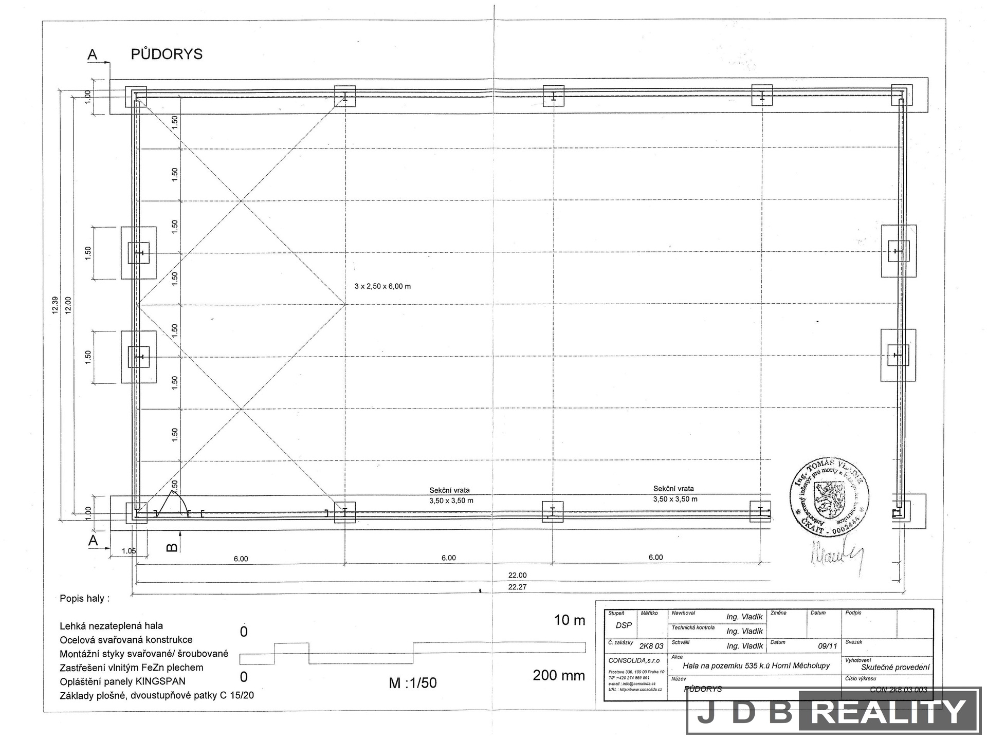 Jedná se o zateplenou ocelovou halu, která je opláštěná panely Kingspan o zastavěné ploše 275 m2 a rozměrech zhruba 12,5 x 22 m se dvěma vjezdy o šířce 3,5 m a výšce 3,5 m, umožňující snadnou nakládku a vykládku materiálu nebo zboží. Sedlové zastřešení haly je provedeno z FeZn plechu, hala je opatřena okapy pro odvod dešťové vody a vnějším osvětlením. Po obvodu haly je dostatečné množství oken, takže ve vnitřních prostorách je dostatek denního světla. Prostory jsou vytápěny kotlem na tuhá paliva, který je umístěn v samostatné místnosti a je napojen na velké množství radiátorů, které jsou rozmístěny po celém obvodu haly. Zateplený strop ve výšce 4,1m je opatřen dostatečným množstvím osvětlení.