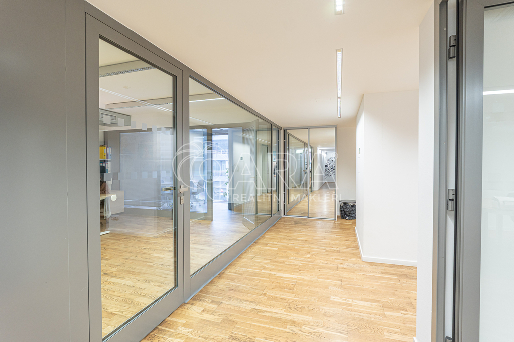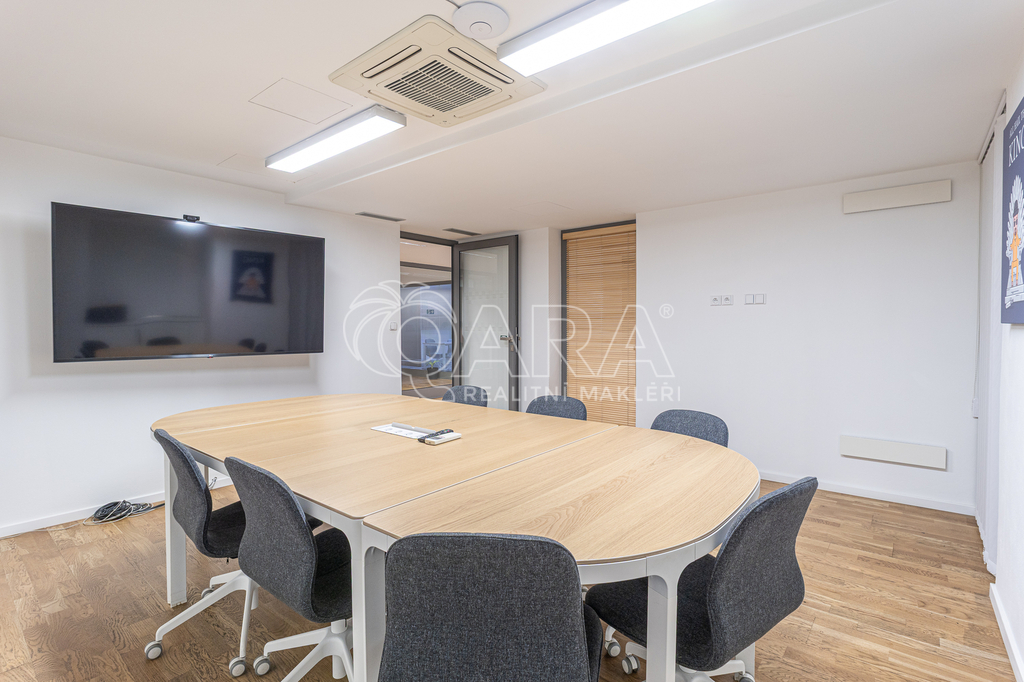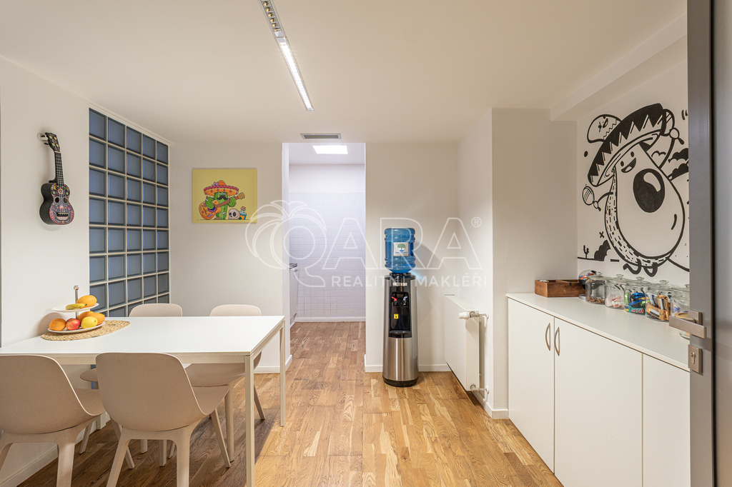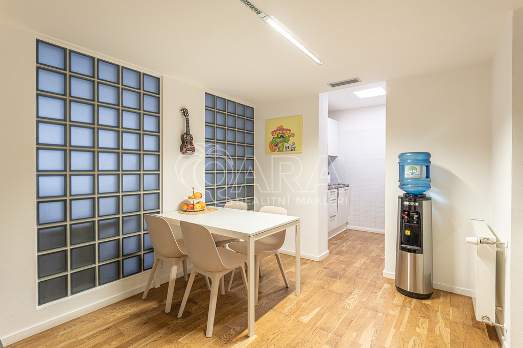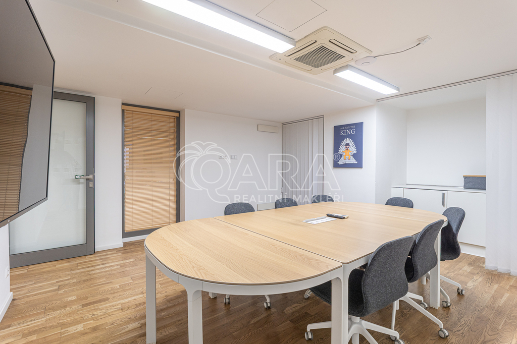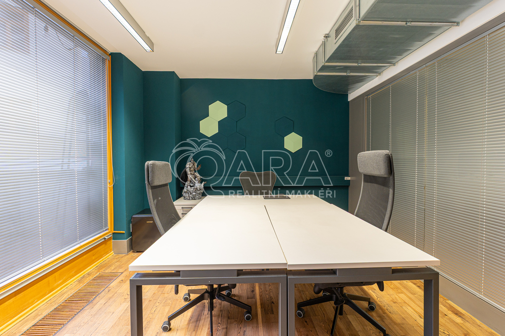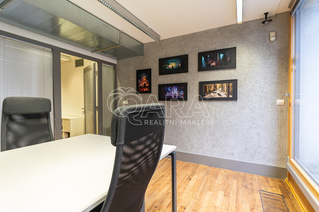 Prostor o celkové rozloze kanceláří 335 m² je klimatizovaný. Dispozice nabízí dvě větší otevřené místnosti, dvě místnosti oddělené skleněnou stěnou, přičemž jedna z nich má vstup na terasu o velikosti 17 m², samostatnou uzavřenou místnost, zasedací místnost a prostor pro recepci či posezení návštěv. Zázemí zahrnuje kuchyňku, jídelní kout, 2x moderní sociální zařízení se sprchou, serverovnu a úklidovou místnost.
