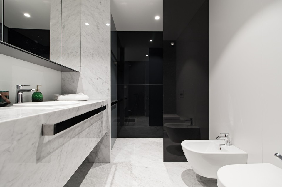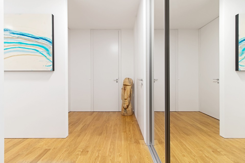 Dispozice bytu zahrnuje vstupní halu, otevřený prostor obývacího pokoje s kuchyní v bílém designu a jídelnou, s přímým výstupem na ochozí terasu, dvě samostatné ložnice rovněž s výstupy na terasu, dvě koupelny – první s vanou, sprchovým koutem, toaletou a bidetem, druhou se sprchovým koutem a toaletou, samostatnou toaletu, dostatek úložných prostor a úklidovou místnost s na míru zhotovenou šatnou. Celý byt lemují ochozí terasy, přístupné ze všech pokojů.