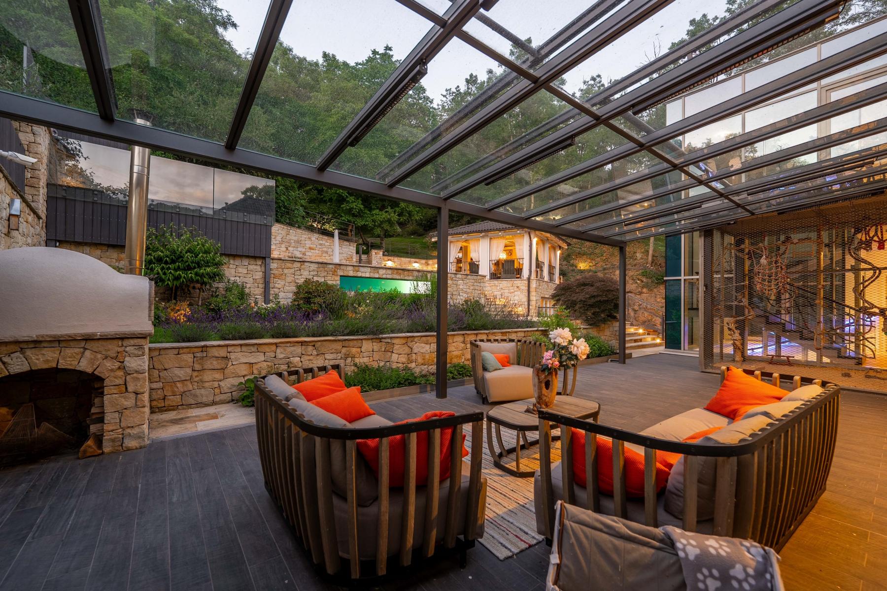 Na první terasu se vstupuje z kuchyně. Terasa má prosklenou střechu s výsuvnou markýzou a infra ohřívači.