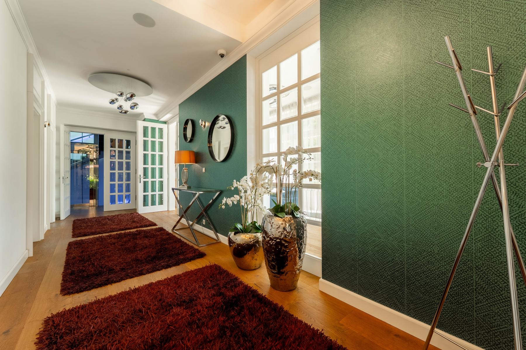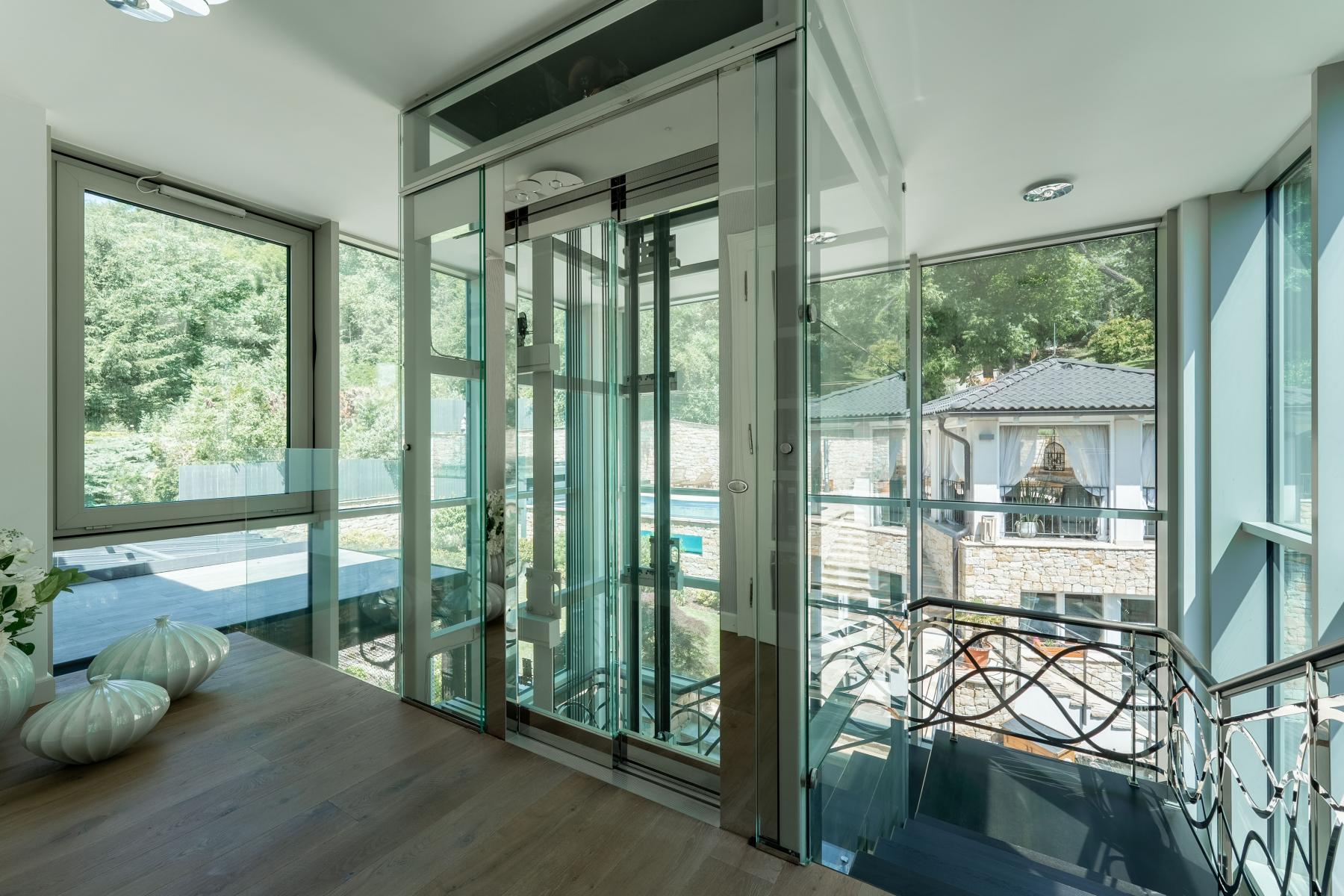 Druhý vstup do vily vede z garáží. Všechna patra jsou propojena proskleným výtahem a schodištěm z masivního dřeva. Prosklený výtah zajišťuje bezbariérový přístup z garáže do celého domu.