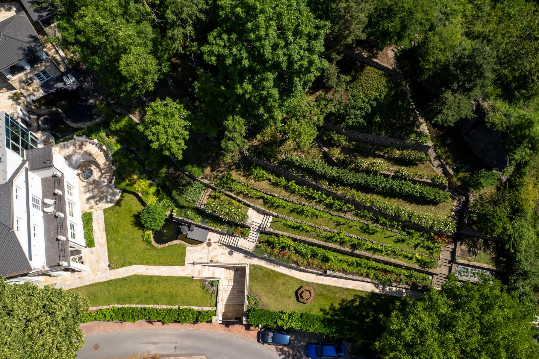 Svažitost a terasovité rozdělení pozemku na jednotlivé zóny, umožňuje jeho ideální využití a zároveň poskytuje dostatek soukromí