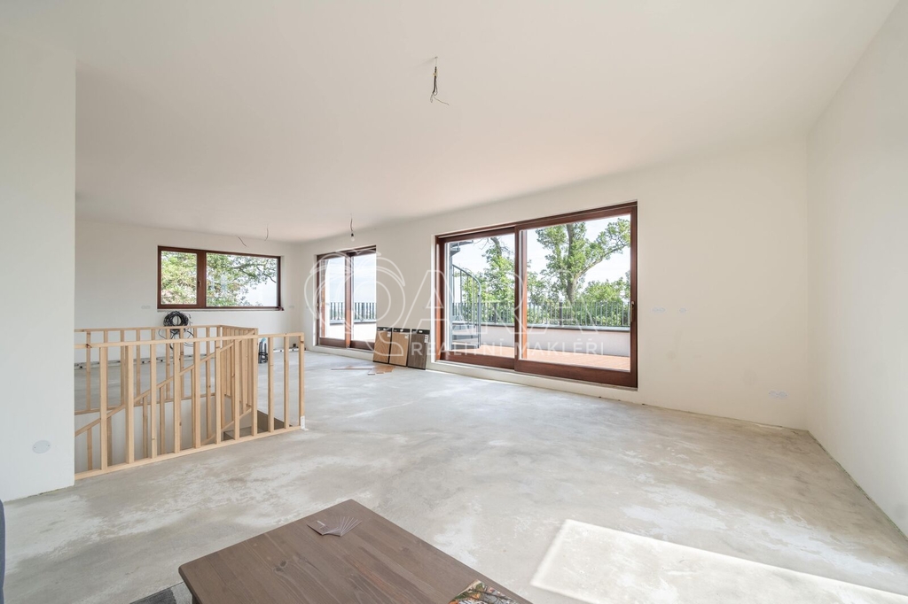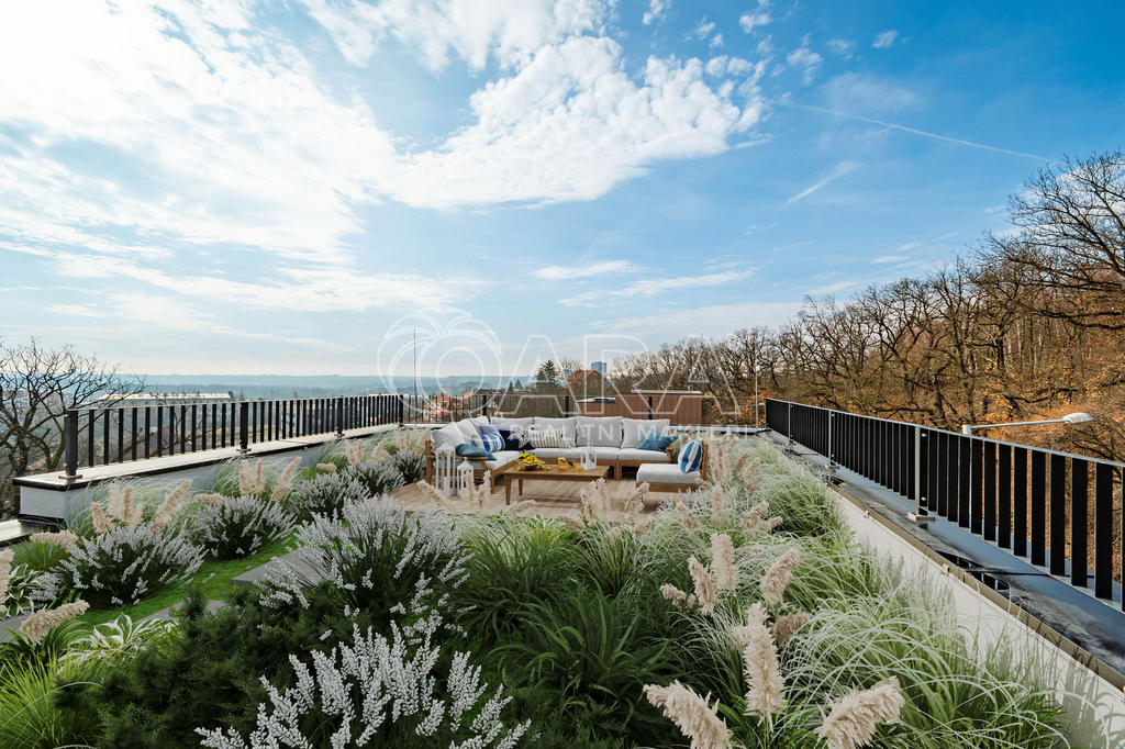 Avšak ta pravá kouzla se začínají dít o patro výš. Obývací pokoj, který je synonymem pro velkorysost a eleganci, se otevírá na terasu o rozloze 30 m2 s výhledem, který bere dech. Zde, nad korunami stromů, máte panoramatický výhled na Prahu a její okolí, což je zážitek, který se nikdy neomrzí. A pak je tu střešní terasa o ploše 50m2, vaše soukromá oáza pro relaxaci, zábavu nebo jednoduše pro chvíle klidu s rodinou. Na straně jedné s Prahou jako na dlani a zelení přírodního parku na straně druhé.