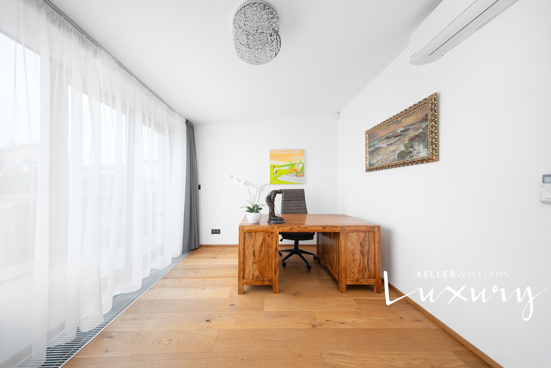 Dominantou bytu je obývací pokoj a prostorná kuchyně, které tvoří otevřený a vzdušný prostor plný přirozeného světla. Horní patro nabízí klidovou zónu s ložnicí a dostatkem soukromí, ideální pro odpočinek po náročném dni. Na patře naleznete také pracovnu/ druhou ložnici se vstupem na balkon.