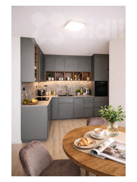 Kuchyňská linka je řešena v moderním designu s důrazem na praktičnost a každodenní komfort. Dispozice bytu nabízí dva samostatné pokoje, ideální jako ložnice a dětský pokoj nebo pracovna.