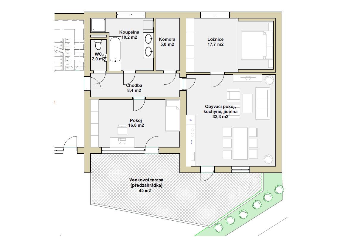 K bytu je možno přikoupit užívání venkovního parkovacího stání za částku 400.000 Kč.