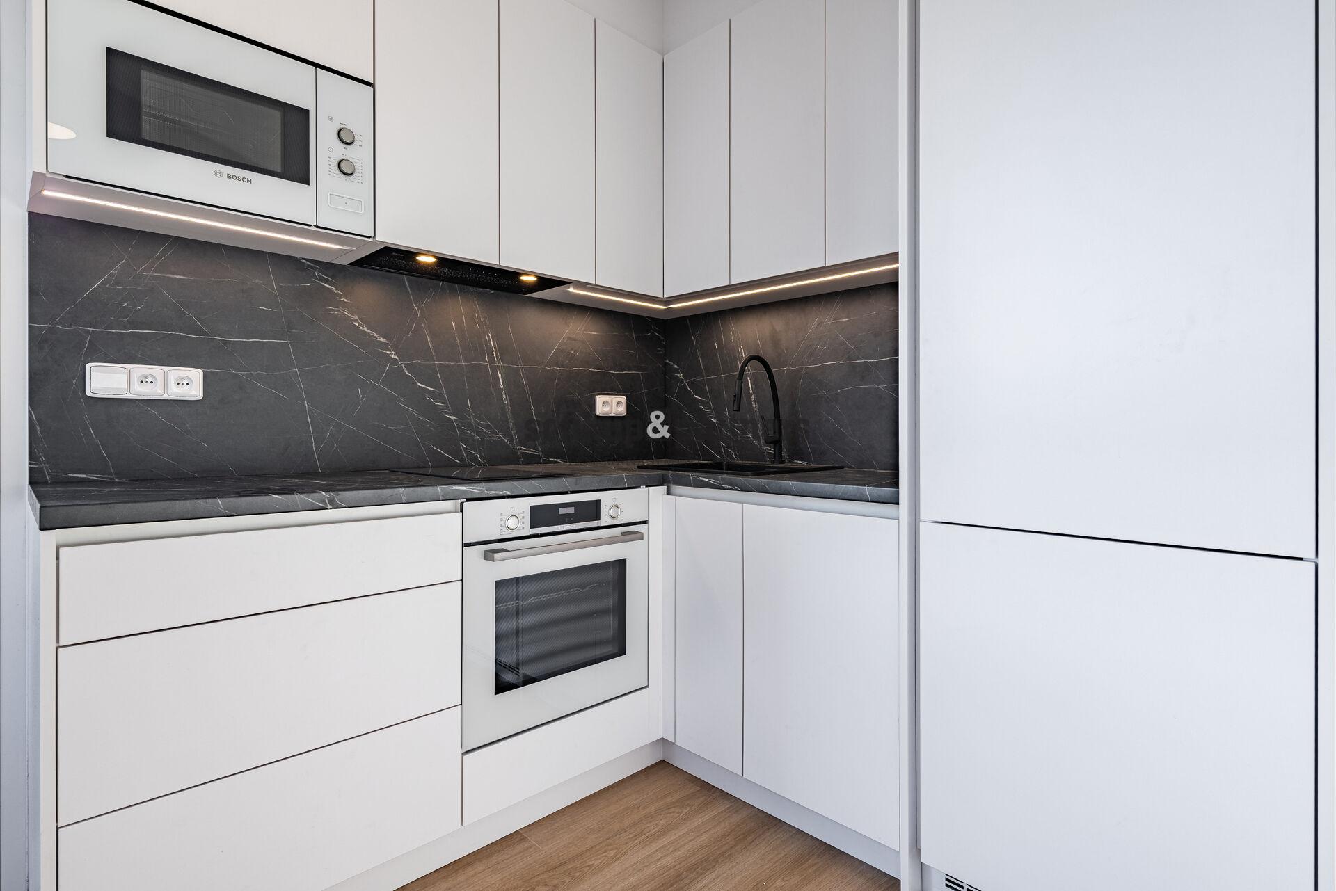 Kuchyňská linka je vyrobena na míru a vybavena vestavěnými spotřebiči značky Bosch – elektrická trouba, mikrovlnná trouba, varná deska, digestoř, myčka a lednice s mrazákem. Pracovní deska i zástěna v tmavém dekoru působí elegantně a nadčasově, horní i spodní skříňky poskytují dostatek úložného prostoru.