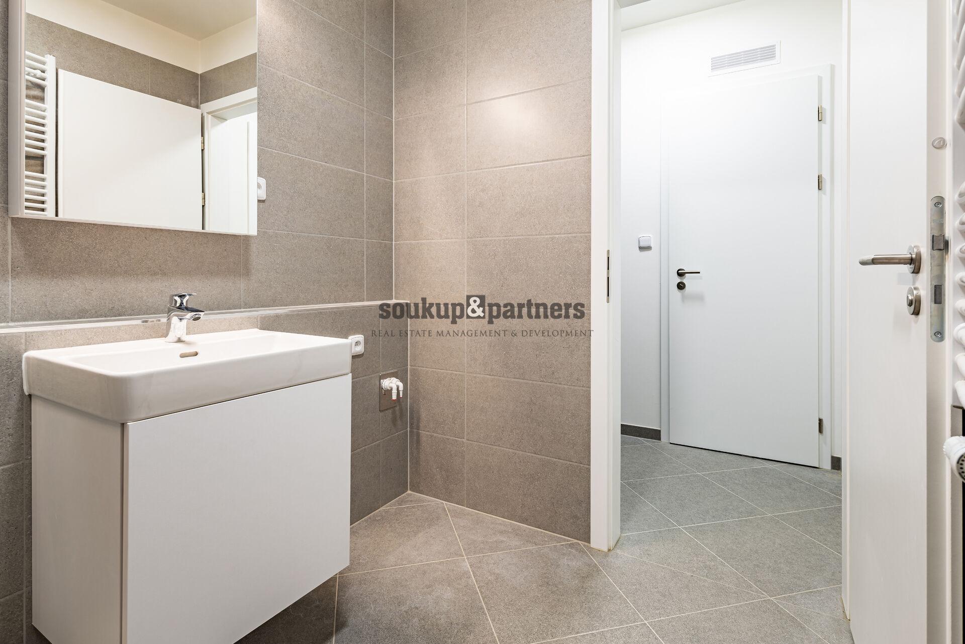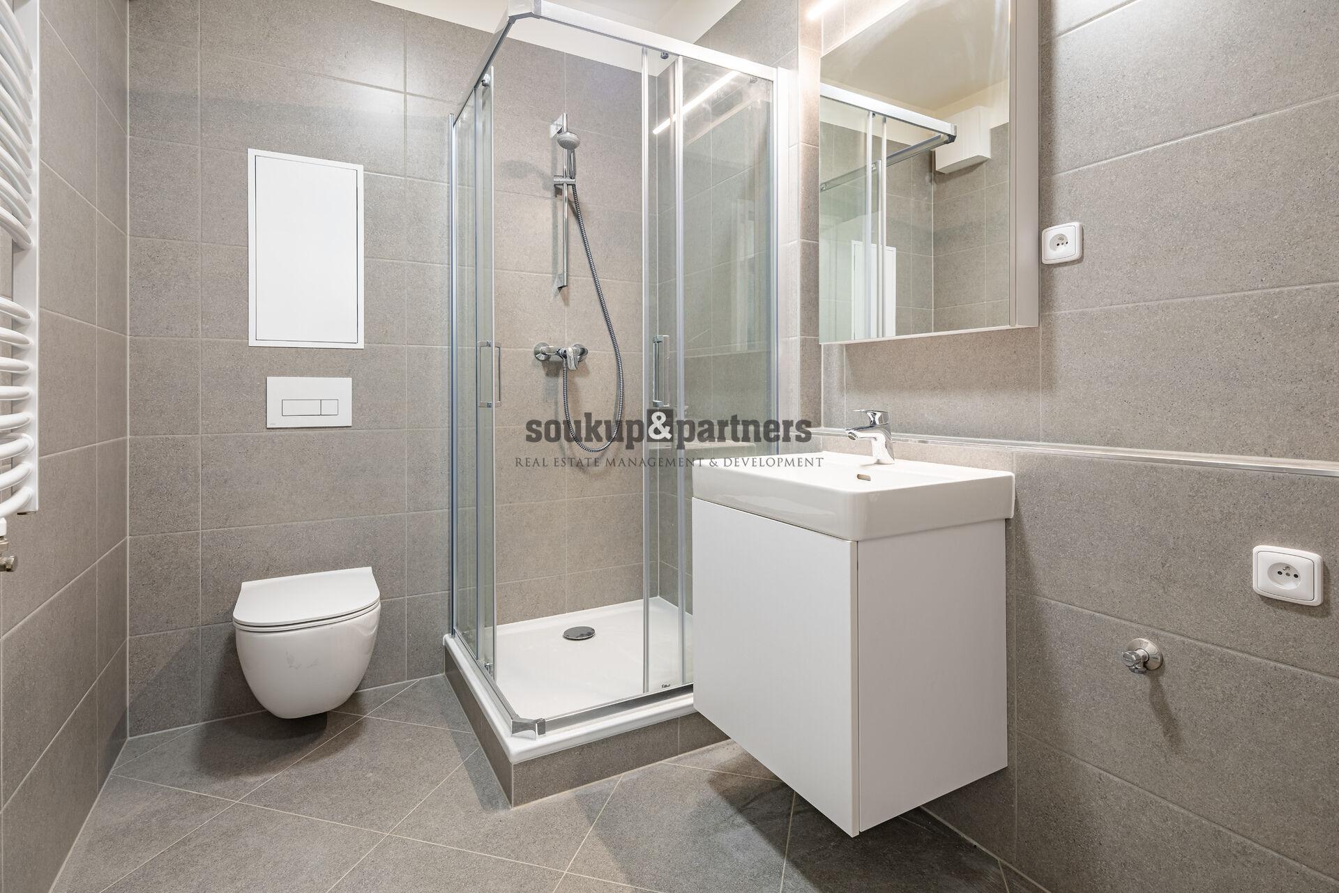 Koupelna je vybavena sprchovým koutem, závěsným WC, podumyvadlovou skříňkou a zrcadlovou skříňkou s osvětlením. Celý prostor působí čistě, moderně a nadčasově.