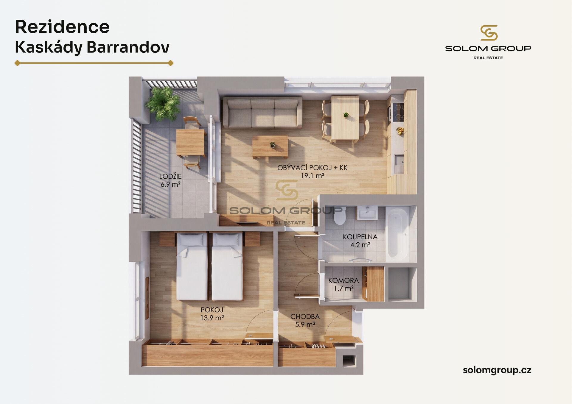 Prodej nového rohového bytu 2+kk, 47,3 m² + lodžie 6,9 m², který se nachází ve 2. NP cihlové novostavby v rezidenci Kaskády Barrandov, Praha 5 – Hlubočepy (Dům R) .