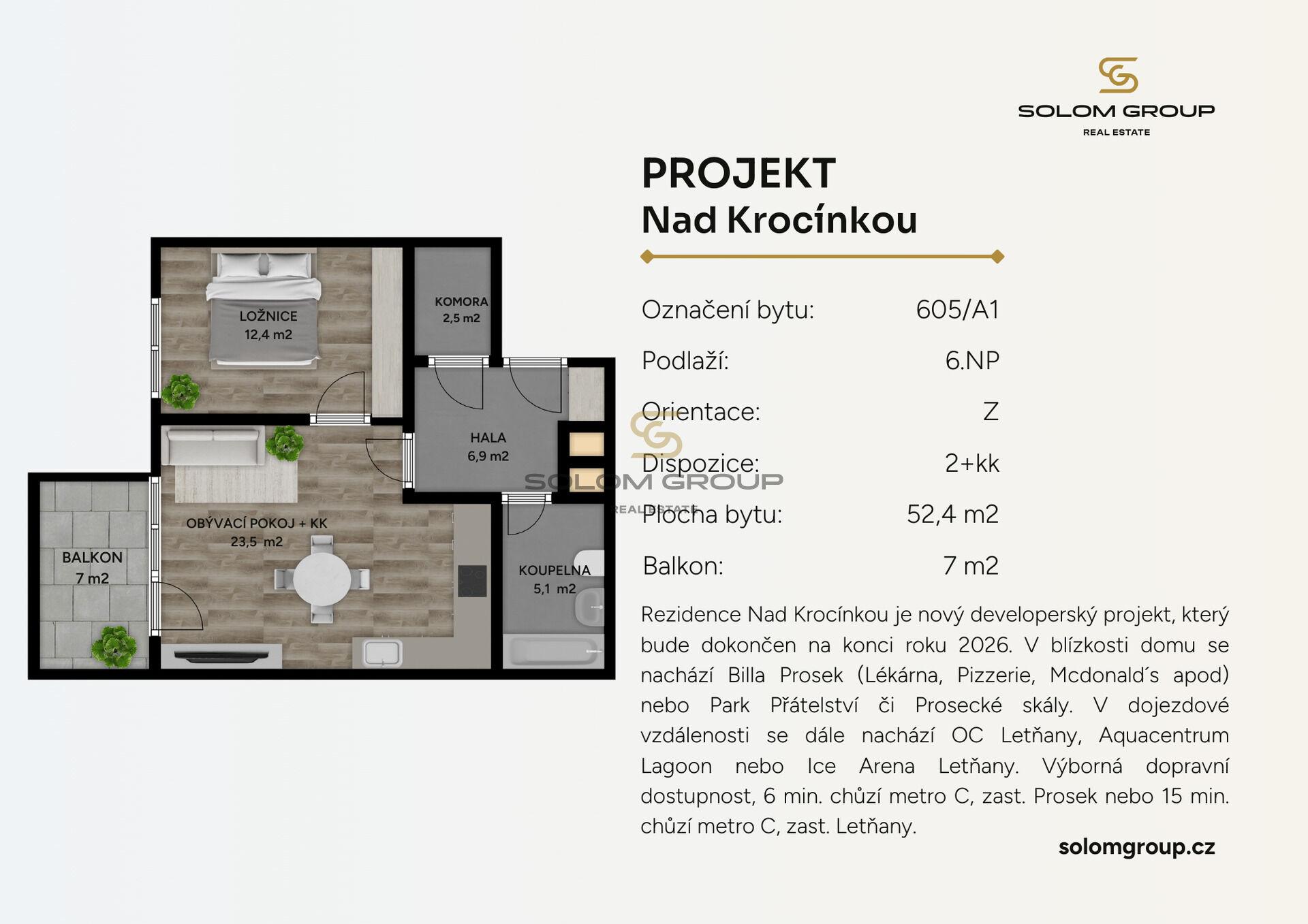 Prodej nového bytu 2+kk, 59,5 m² (byt o výměře 52,4 m² + balkon o výměře 7 m²), který se nachází v 6. NP cihlové novostavby v Rezidenci Nad Krocínkou III, Praha 9 – Prosek.