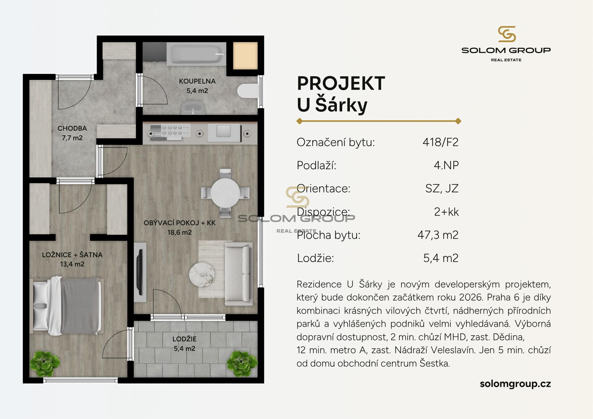 Prodej nového bytu 2+kk o velikosti 47,3 m² + lodžie 5,4 m², který se nachází ve 4. NP cihlové novostavby v rezidenci U Šárky, Praha 6 – Ruzyně (Dům F2).