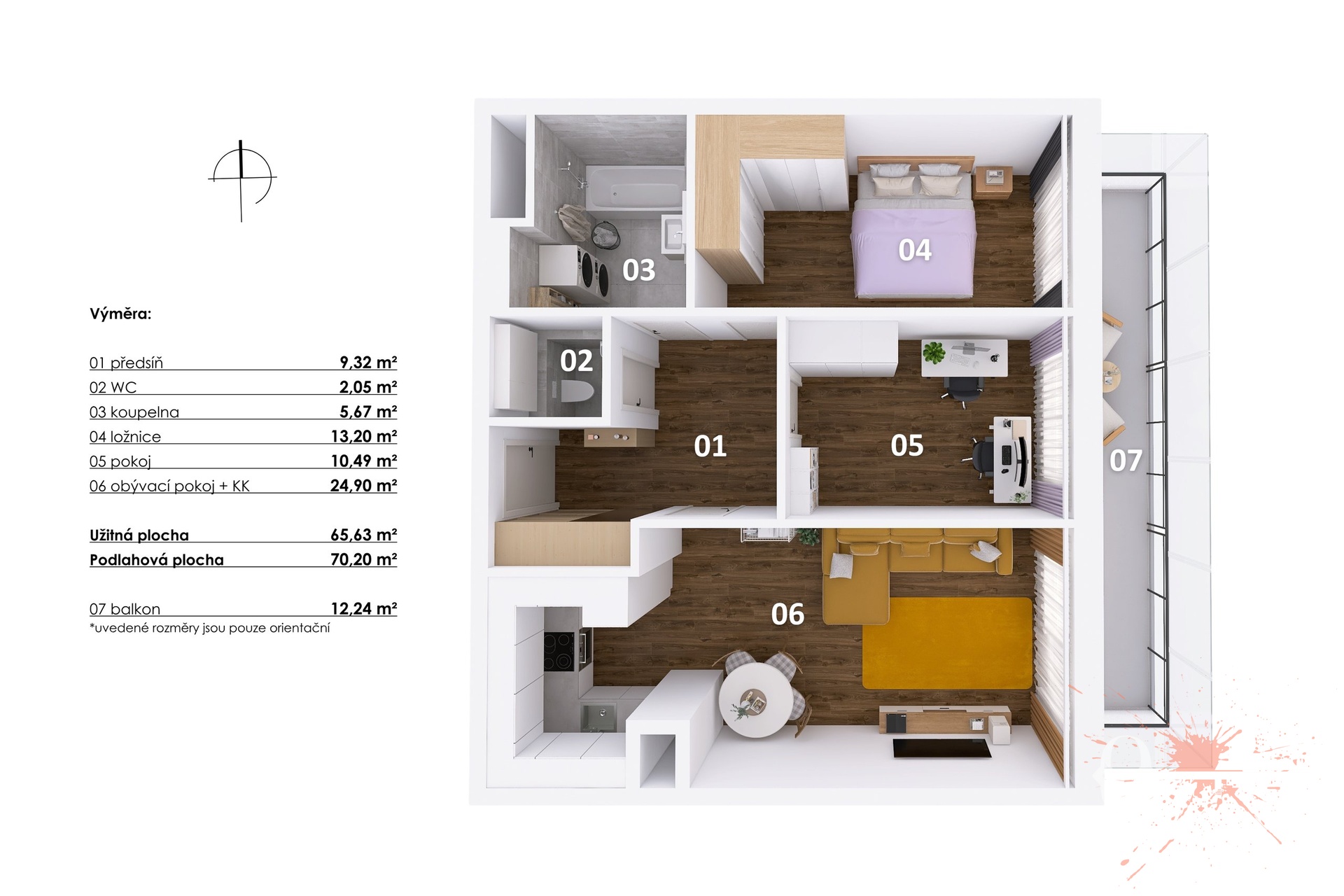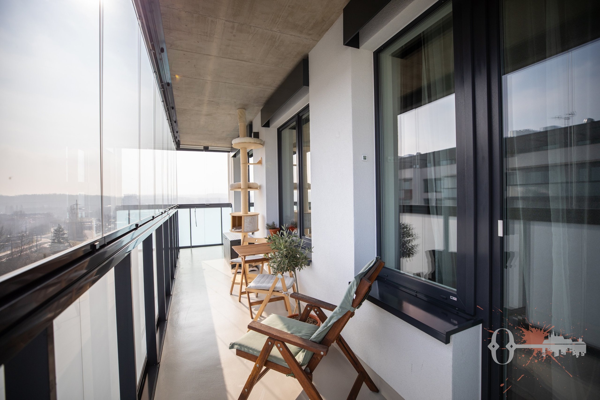 Dominantou bytu je velkorysý balkon o velikosti 12 m² s krásným otevřeným výhledem a dostatkem prostoru pro pohodlné posezení i odpočinek. Balkon je zasklený a doplněný elegantními plisé roletami, takže se z něj stává příjemné místo pro ranní kávu, večerní relaxaci i klidné chvíle během dne téměř po celý rok. V bytě je navíc připravena instalace pro předokenní rolety, které mohou komfort bydlení ještě zvýšit.
