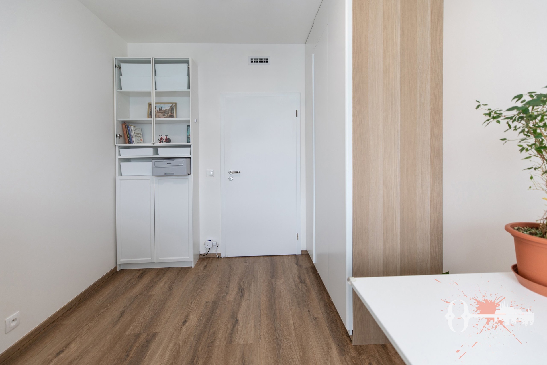 Byt o dispozici 3+kk se nachází v ulici Laponská v oblíbené části Hloubětína. Interiér působí vzdušně, čistě a harmonicky. Vše je zde stále jako nové – kuchyňská linka i nábytek a stejně jako samotný byt i celý dům jsou ještě v záruce.
