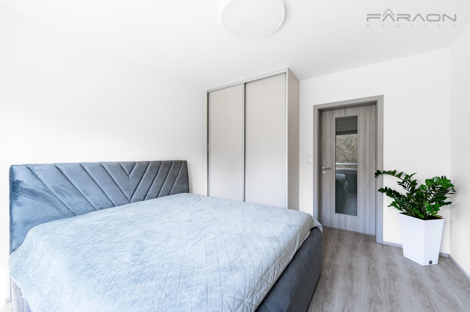 Dispozice bytu zahrnuje otevřený koncept obývacího pokoje s jídelní částí a přímým vstupem na terasu vhodnou pro letní posezení, kuchyňský kout s jídelním stolem, samostatnou ložnici, vstupní chodbu, prostornou koupelnu s vanou a závěsnou toaletou, sklep a parkovací místo v suterénu domu.