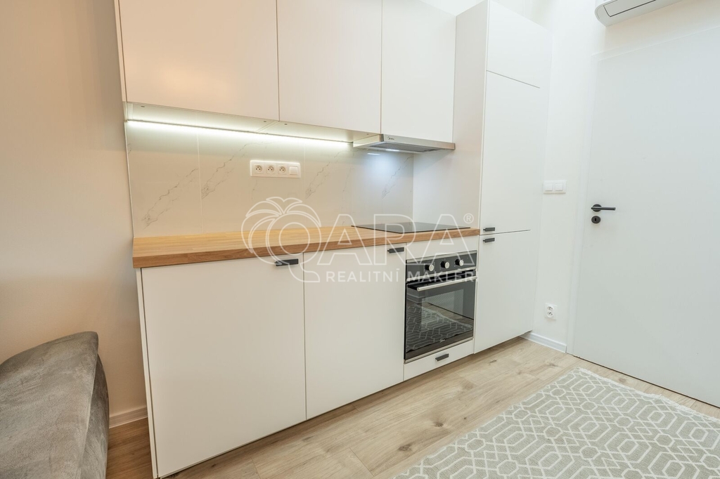 V bytě je kompletně vybavená kuchyně s vestavěnými spotřebiči (lednice, trouba, indukční deska, myčka nádobí). Vytápění i chlazení prostoru zajišťuje klimatizace a elektrické radiátory, ohřev vody zajišťuje boiler.