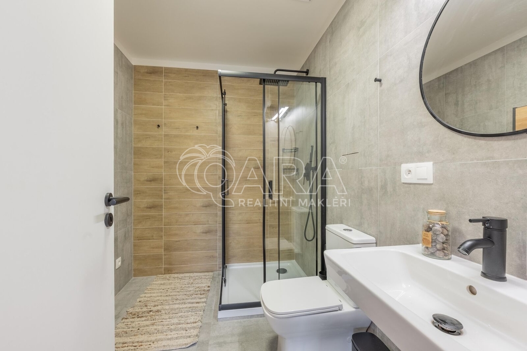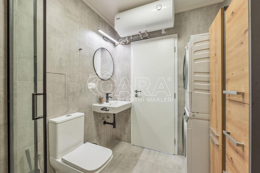 Koupelna se sprchovým koutem a toaletou nabízí dostatek prostoru pro ranní vypravování se do práce, klidně i ve dvou. Součástí prodávané nemovitosti je pračka a sušička.